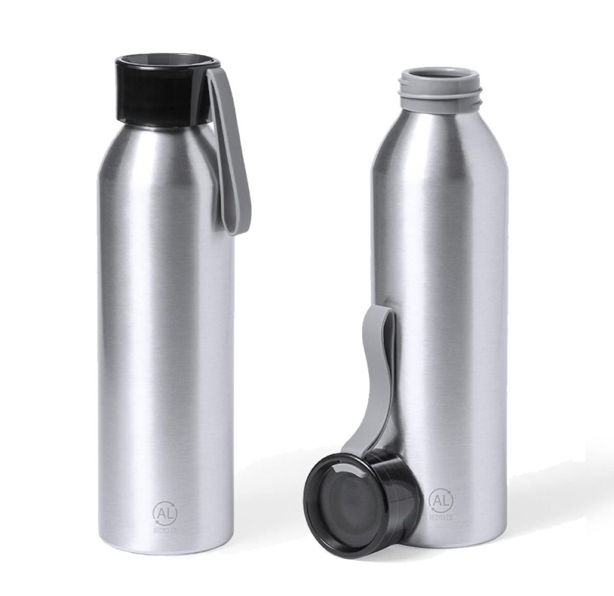 650 ml capacity bottle. Made of recycled aluminium, a material with almost infinite recycling possibilities, keeping its original properties and consuming less energy in this process. Matte finish, with black screw cap and carrying silicone strap. BPA free and presented in an individual box with kraft design.