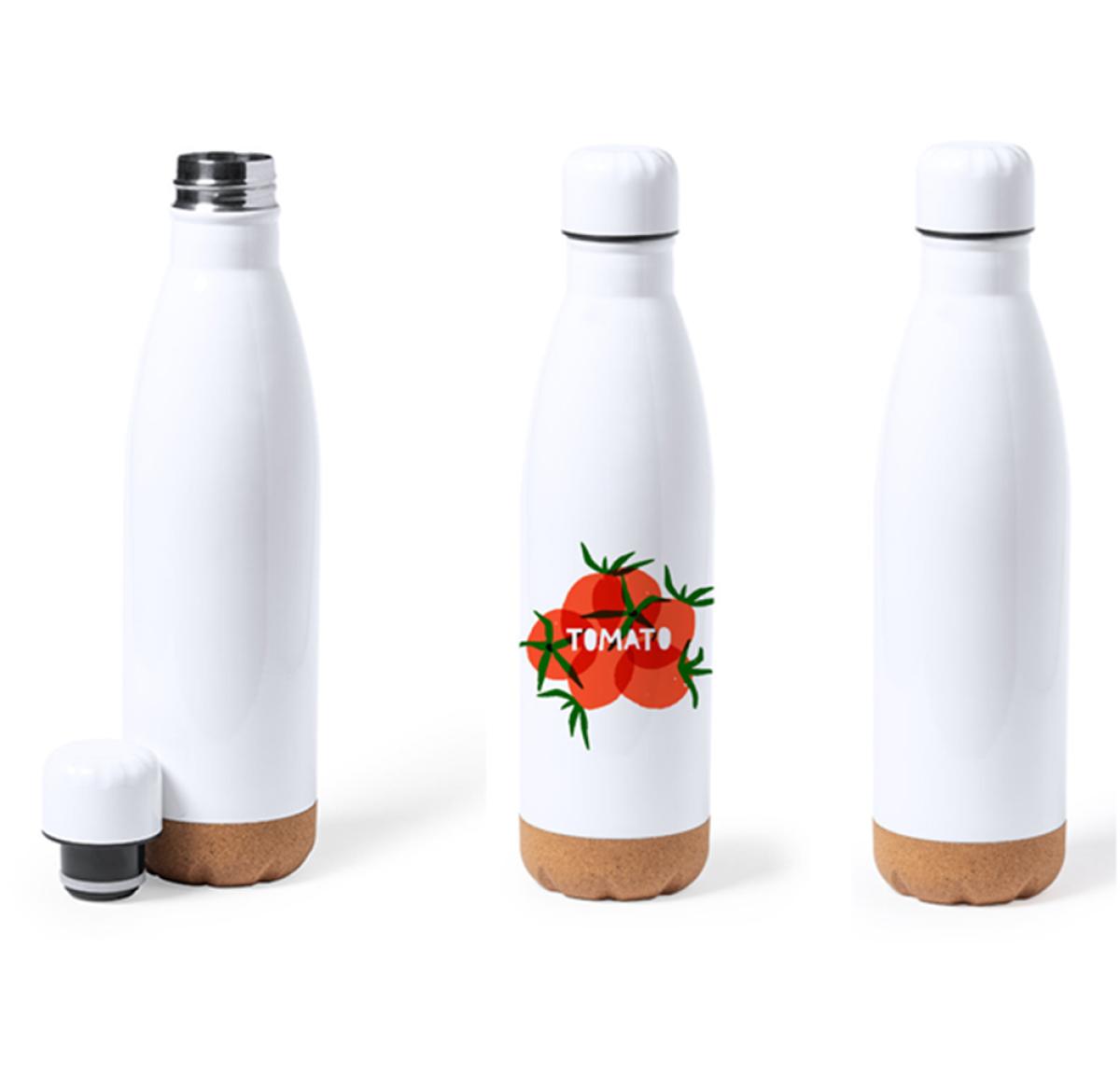 750 ml capacity bottle, made in stainless steel and specially designed for sublimation printing. Gloss white finish, with matching screw cap and natural cork base. BPA free and presented in an individual box with kraft design.