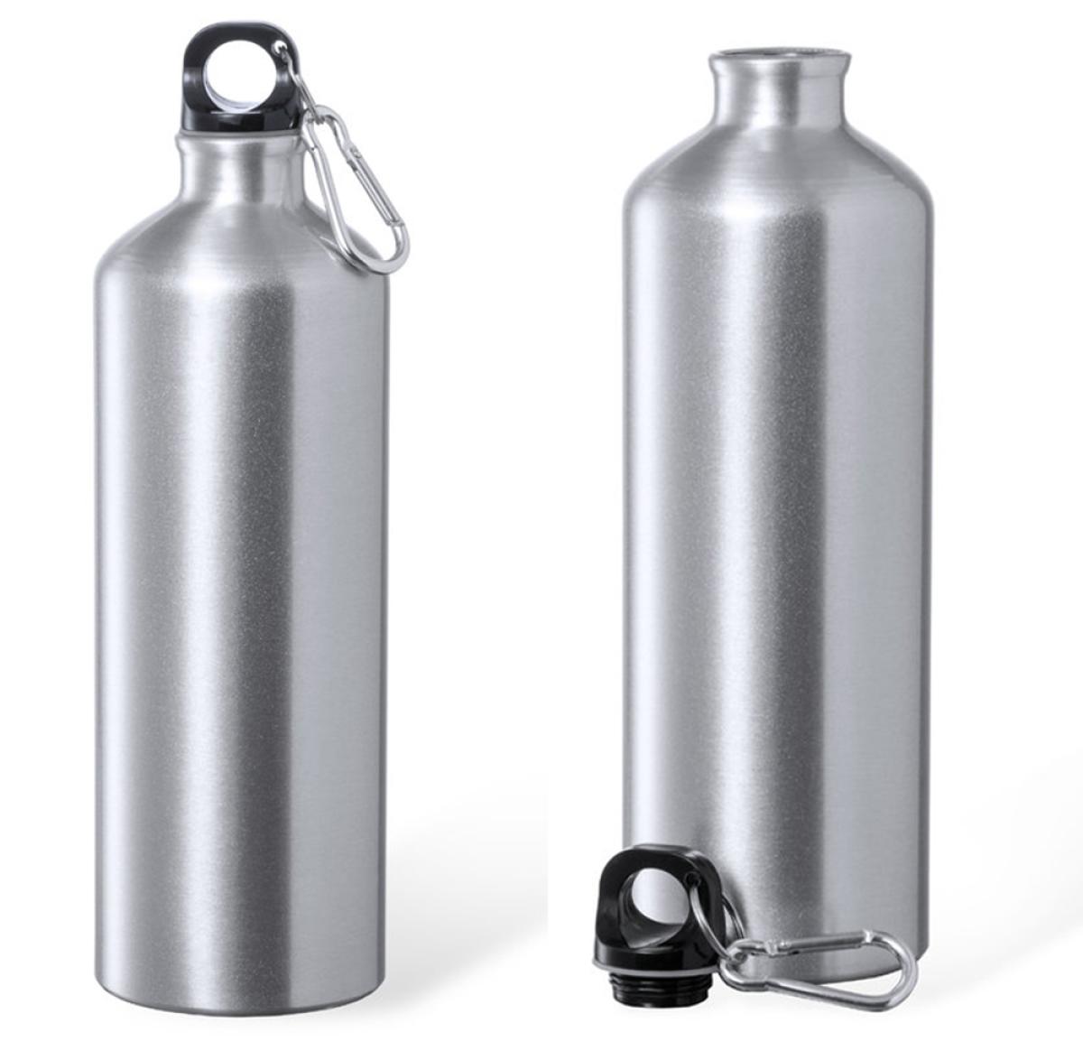 1 l capacity bottle, made of glossy aluminium. Black screw cap, with ring and carrying carabiner. BPA free and presented in an individual box with kraft design.