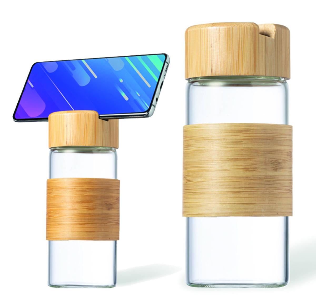 Nature line multifunctional bottle with a capacity of 450 ml. Body made of glass, with central strip in bamboo. Including bamboo screw cap with integrated smartphone holder. Presented in an individual eco-design box.
