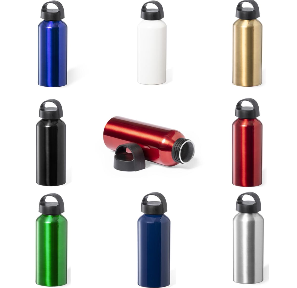 500 ml capacity bottle, made of aluminium with glossy finish. Black screw cap with integrated handle, BPA free. Available in a wide range of colours and presented in an individual box with kraft design.