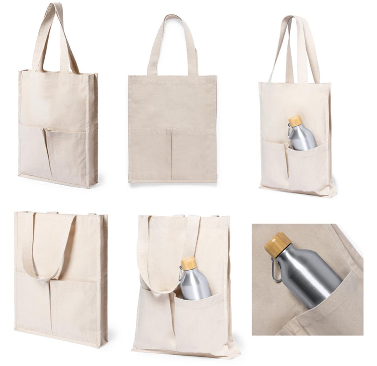 Bag made of 100% cotton, natural finish and extra weight of 310g/m2. With two outside pockets, stitched finish and with gusset. Extra wide and reinforced medium handles (58 x 3.5 cm). Resistance up to 10 kg in weight.