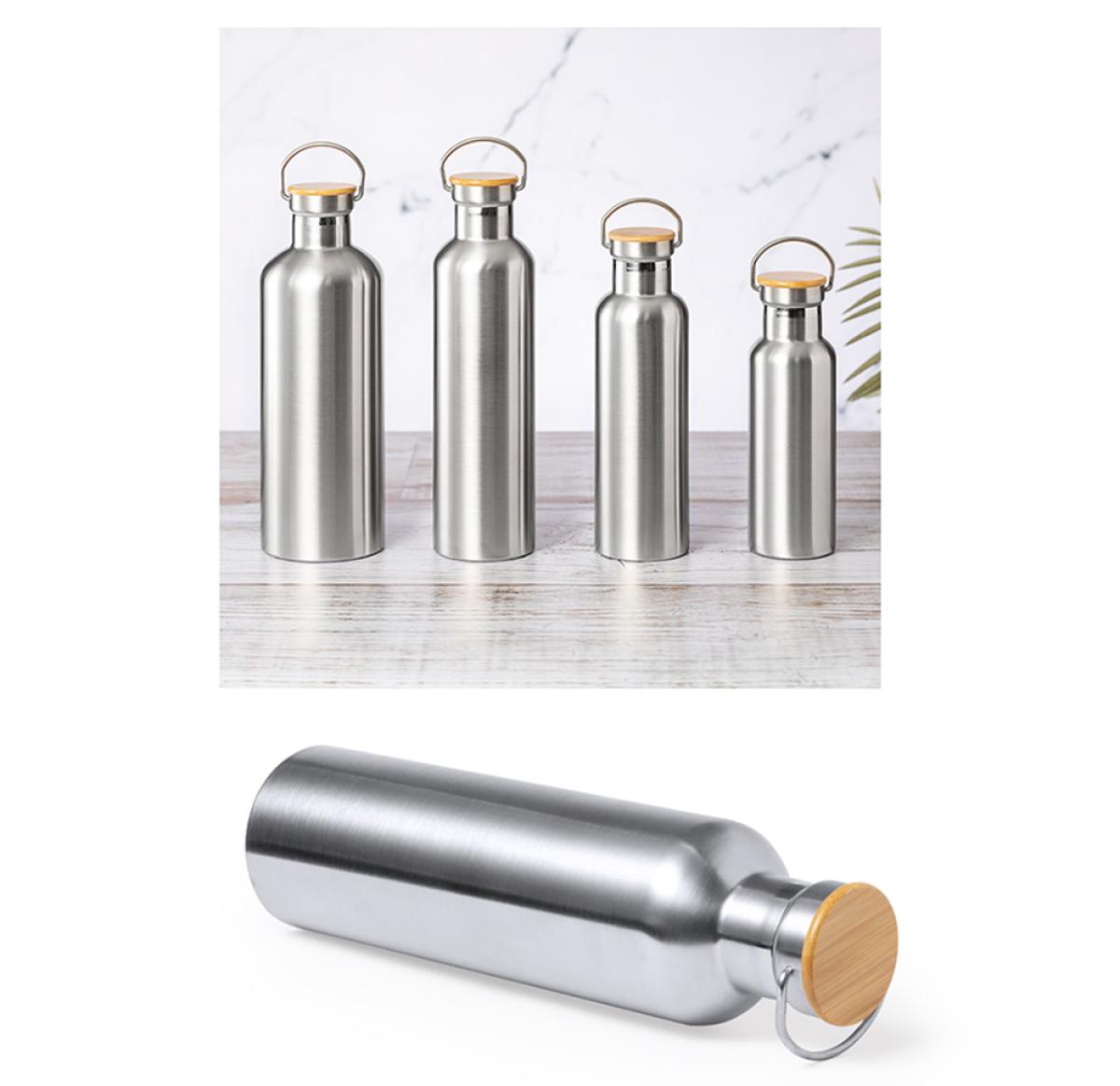 1 l capacity thermal bottle, made in double wall stainless steel with matte finish. Including original stainless steel screw cap with bamboo detail and integrated handle. BPA free and presented in an individual box with kraft design.