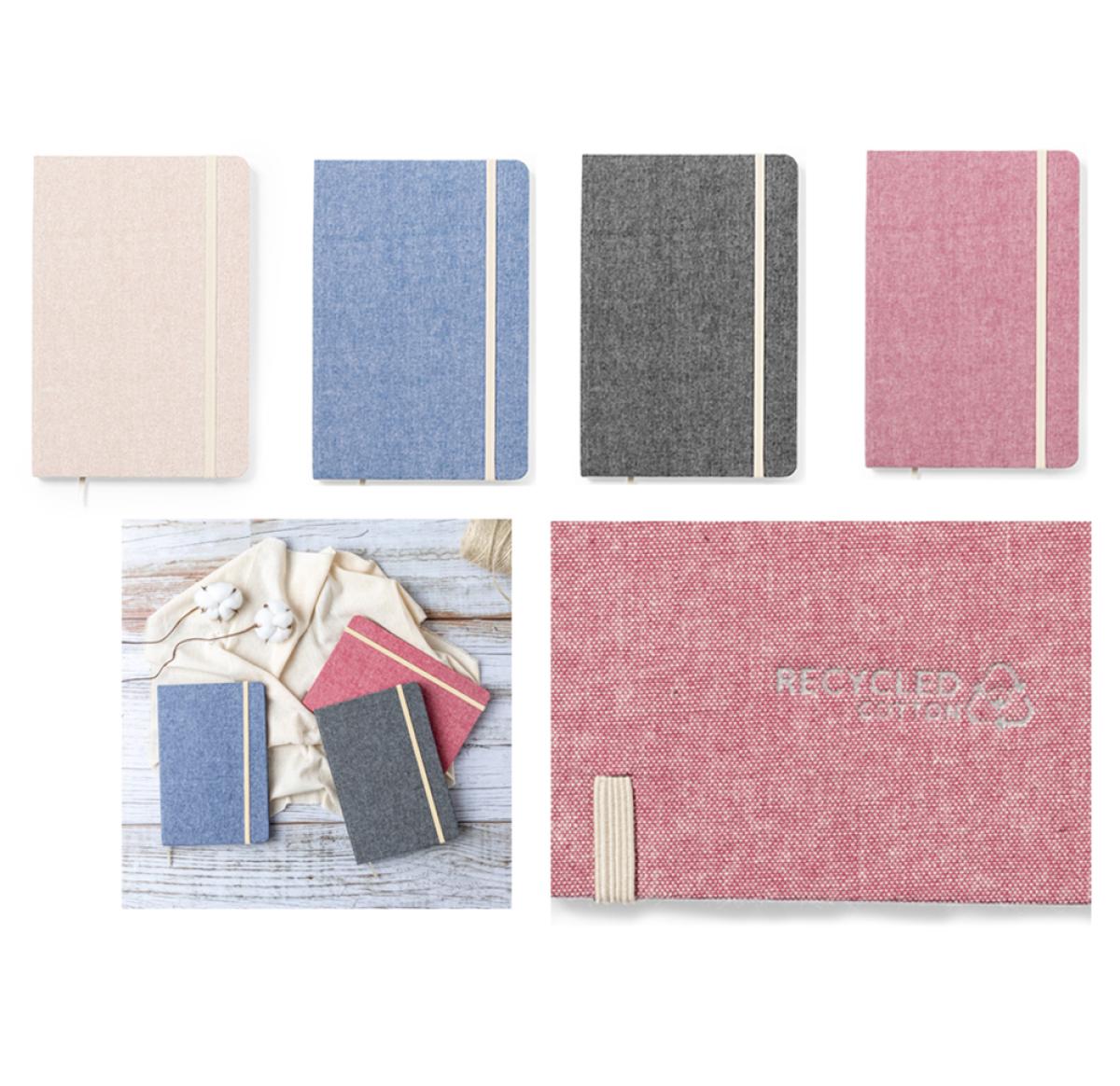 Nature line notepad made of 100% recycled cotton. With hard covers and elastic band in contrasting colour. Inside with 100 plain sheets and fabric bookmark. Available in a wide range of colours, with recycled cotton logo on the back cover.