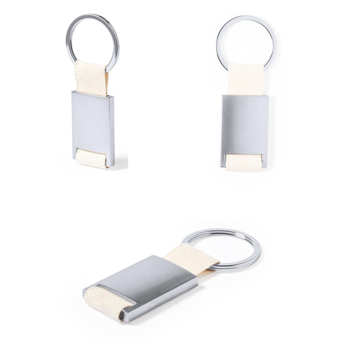 Keyring with silver finish metal body. 100% cotton ribbon with natural finish, with wide branding surface and matching metal ring. Presented in an individual bag with kraft cardboard insert.