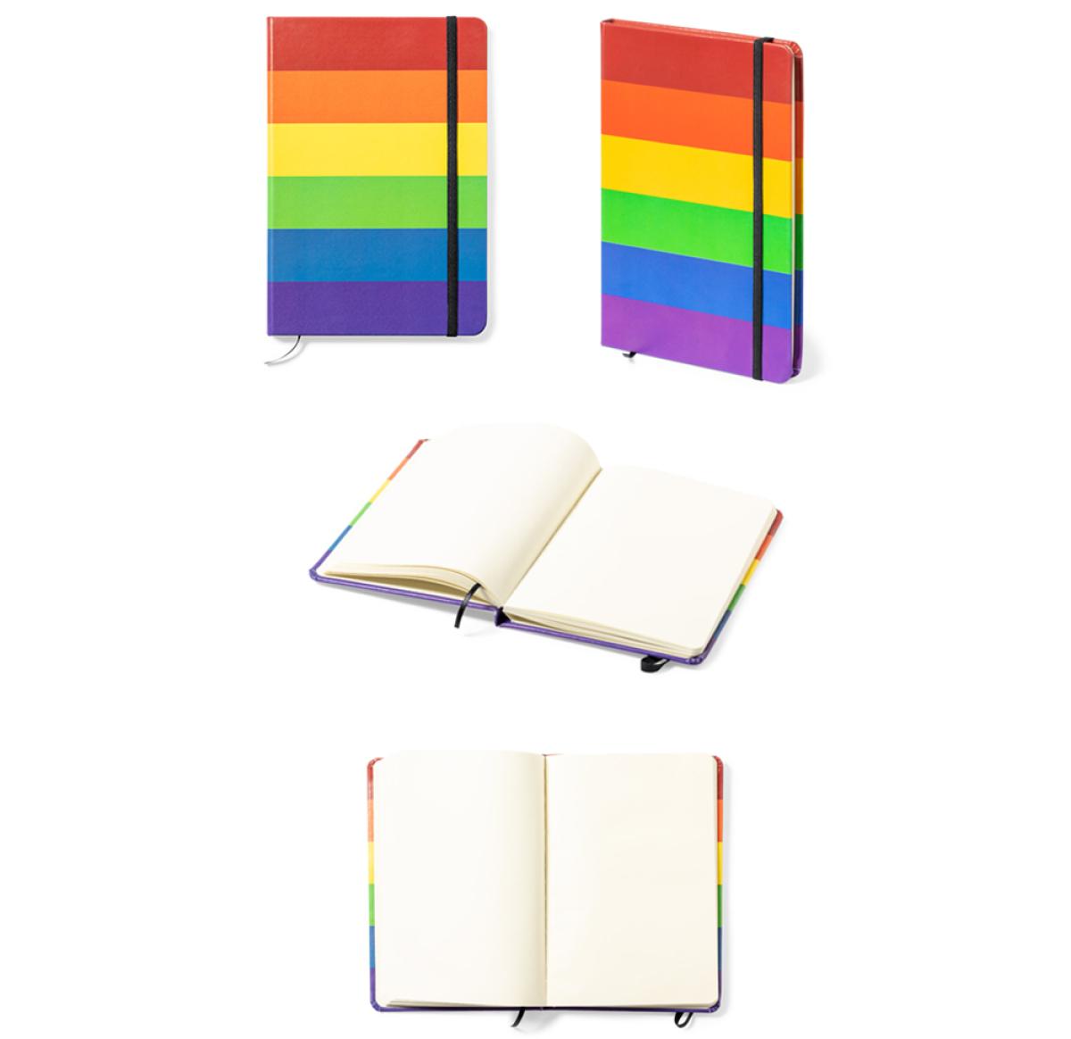Multicoloured Rainbow notepad, with soft touch PU leather hard covers and elastic band. A notebook to be proud of, with 100 plain sheets inside and fabric bookmark.