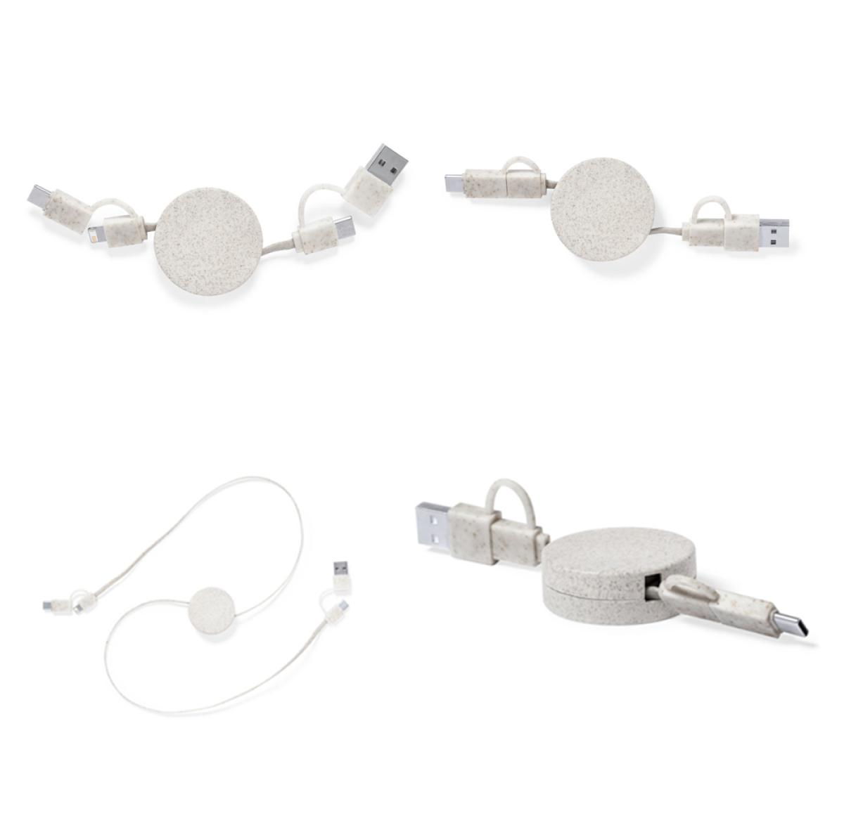 Extendable charger and synchroniser cable, suitable for charging devices and transferring data. Made of wheat straw, to promote the use of natural raw materials and reduce pollutant emissions. Central part with extendable inner mechanism. Including Type-C and USB input connections; Lightning, Micro USB and Type-C outputs. 5V DC 2.4A. Presented in an individual kraft design bag. Suitable for data transfer. Extendable Cable. Micro USB, Type C and Lightning Connection 9V DC 2.1A.