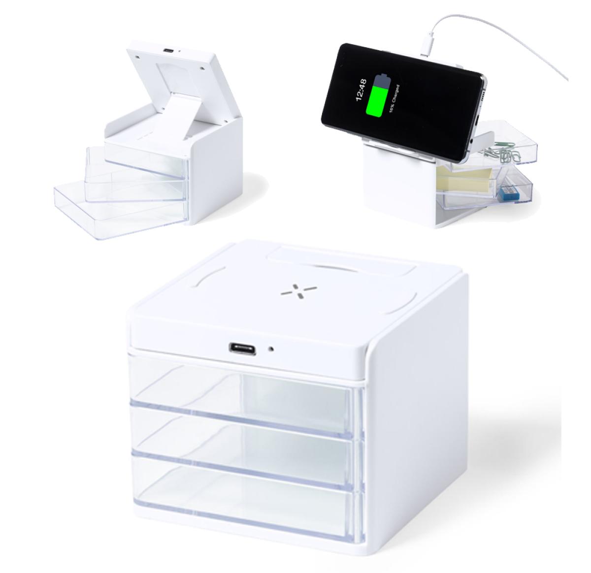 Charger organizer with smartphone holder and integrated 10W wireless charger, compatible with devices equipped with Qi wireless charging technology. With 3 transparent, detachable storage compartments. Charging status indicator, with 1m Type C charging cable included. Non-slip base and presented in an individual kraft design box, with instruction manual in English and Spanish.