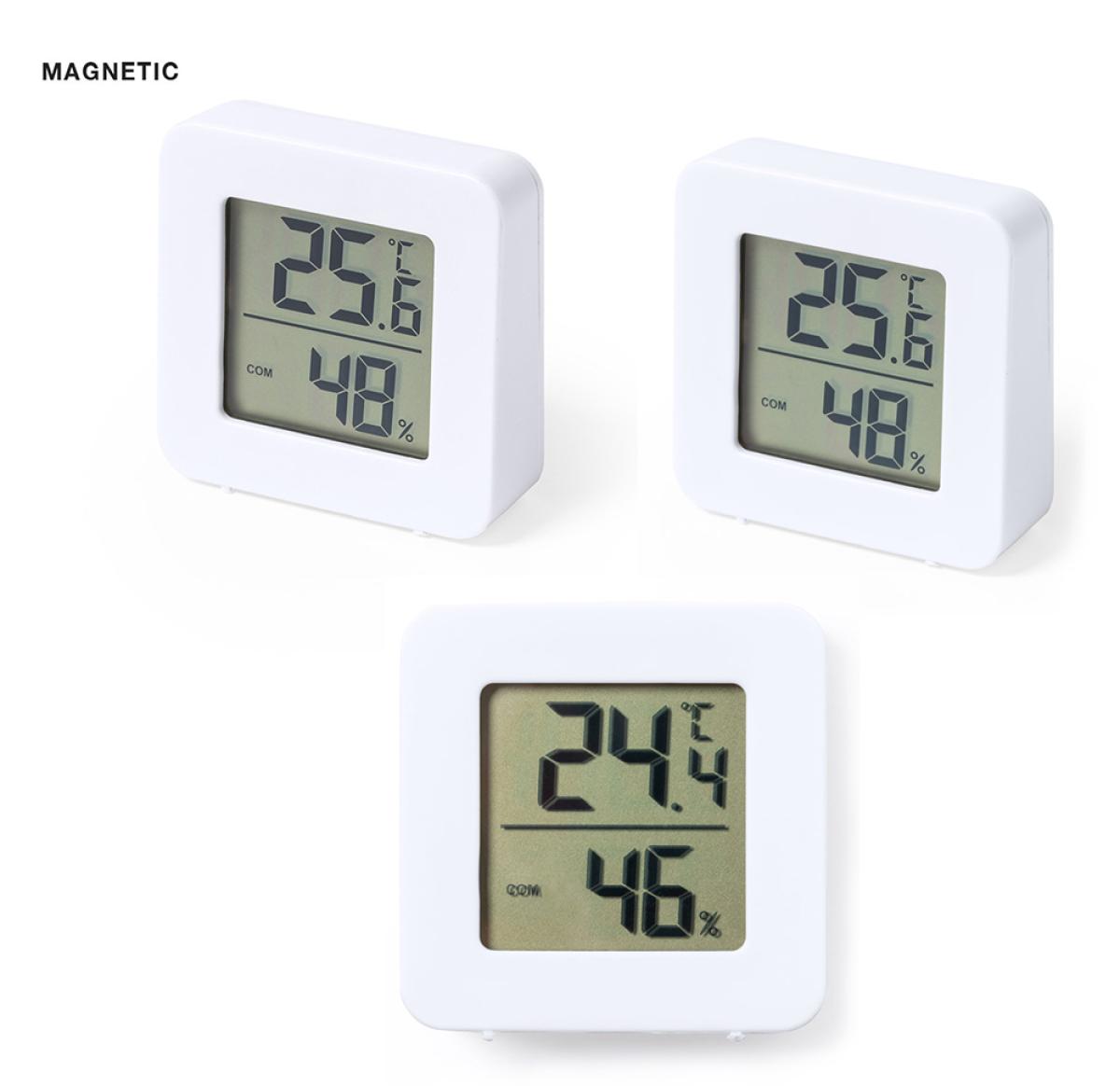 Weather station made in durable ABS with white finish. Easy-to-read LCD display, with thermometer and humidity sensor. Magnetic fixing and battery powered (button cell included, with protective film). Presented in an individual kraft design box, with instruction manual in English and Spanish.