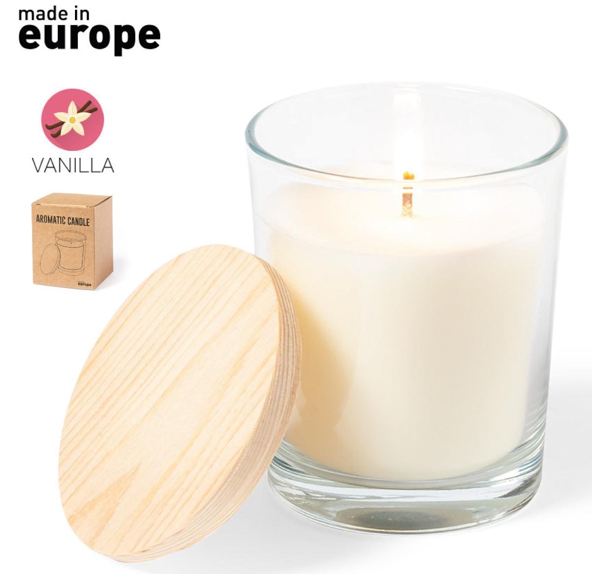 Scented candle in glass jar, with natural wooden lid and vanilla scent. Made In Europe logo.