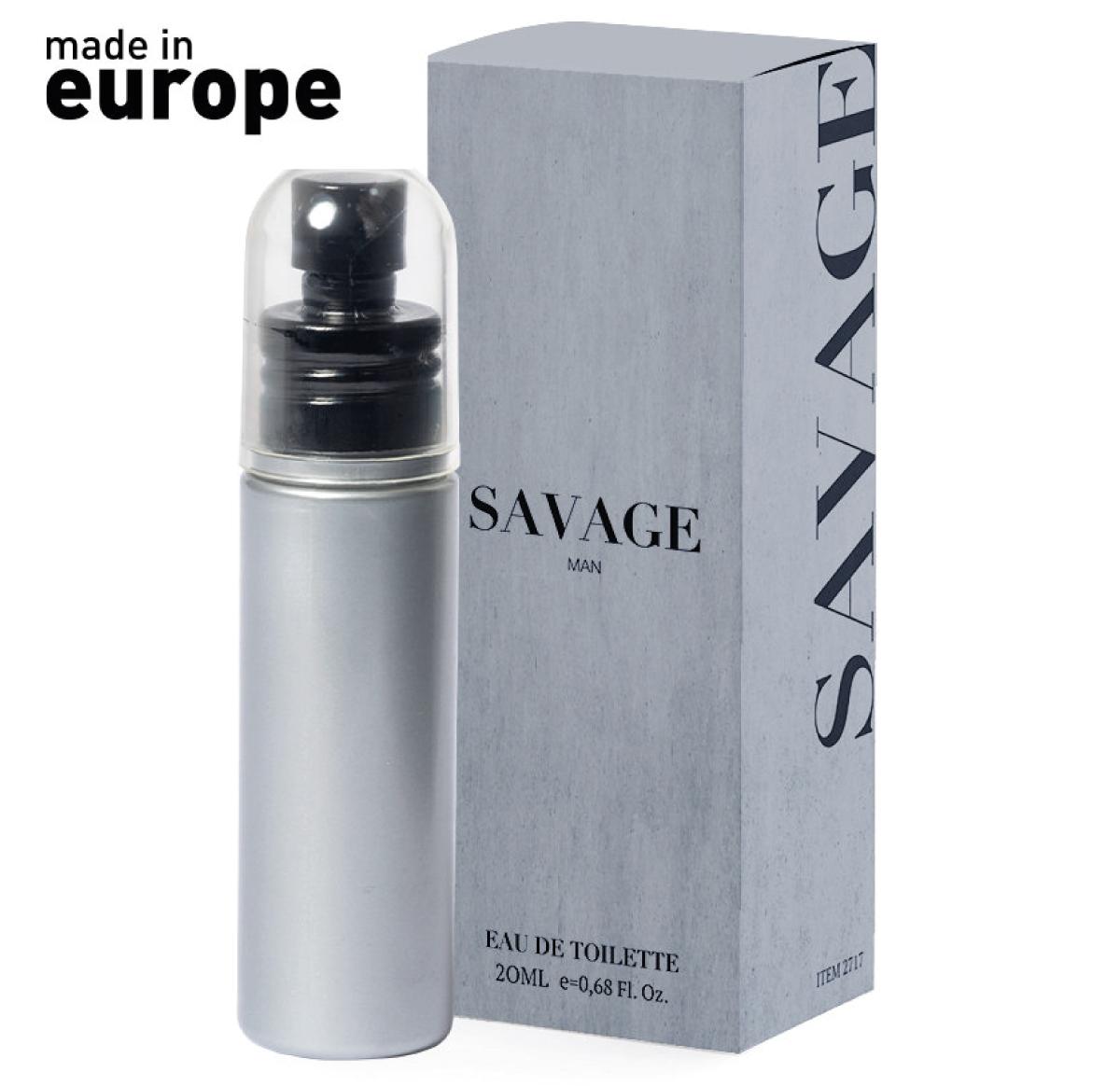 Eau de toilette for men Savage, with a distinctive touch where the olfactory notes blend to create an impeccable balance with woody nuances. In 20 ml refillable spray bottle with transparent cap. Presented in a premium design box.