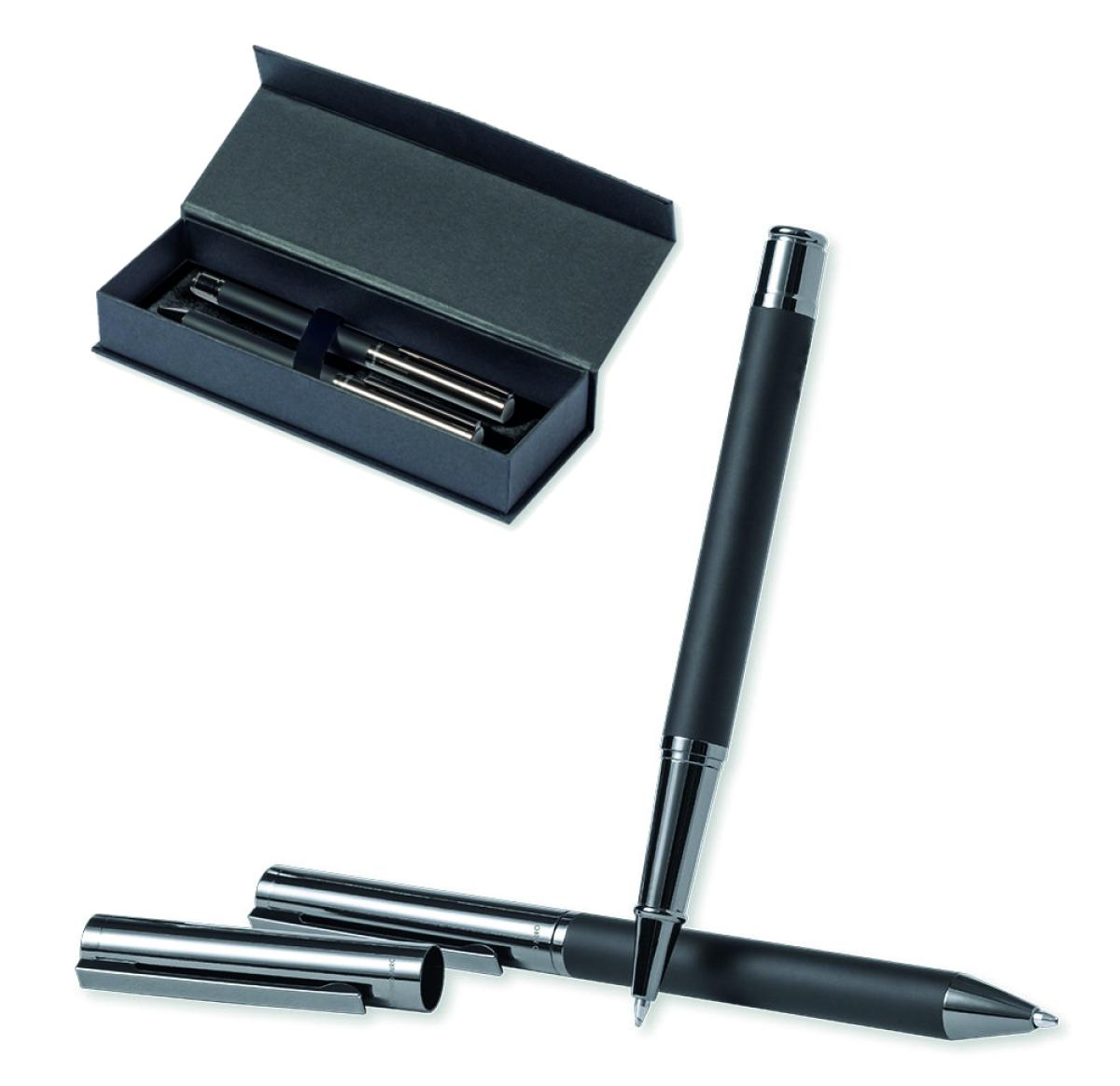 Antonio Mir? ball pen and roller pen set. Including: Metal ball pen with matte black barrel. Chrome plated fittings and cap with brand logo. Jumbo cartridge and blue ink.