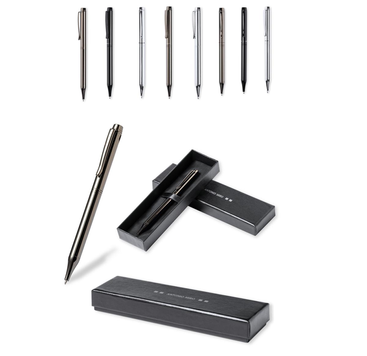 Antonio Mir? ball pen made in shiny metal, with brand logo on the barrel and available in a wide range of colors. With twist mechanism and in blue ink. Presented in an elegant and resistant black individual box with Antonio Mir? logo and matching sleeve.