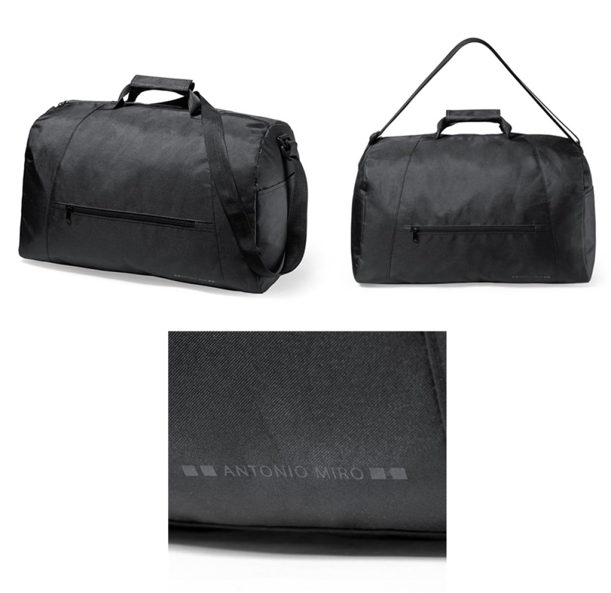 Antonio Miro bag, made of durable 300D polyester with black finish. Main compartment and outer pockets with matching zip closure; velcro carry handles and side pockets. With brand logo on base and adjustable shoulder strap.