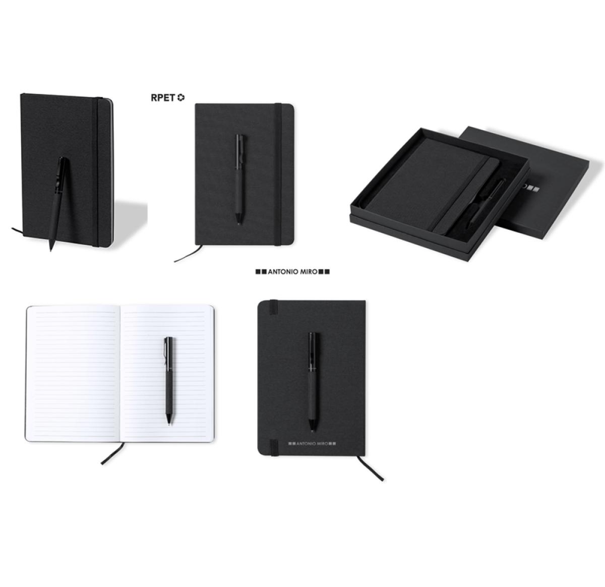 Antonio Mir? notepad and ball pen set. Including: Notepad in an elegant black finish, made of durable 300D polyester, with hard covers and matching elastic band. Inside with 100 sheets of single-stripe layout. Metal ball pen with twist mechanism and blue ink. With black barrel and fittings, metal clip and brand logo.
