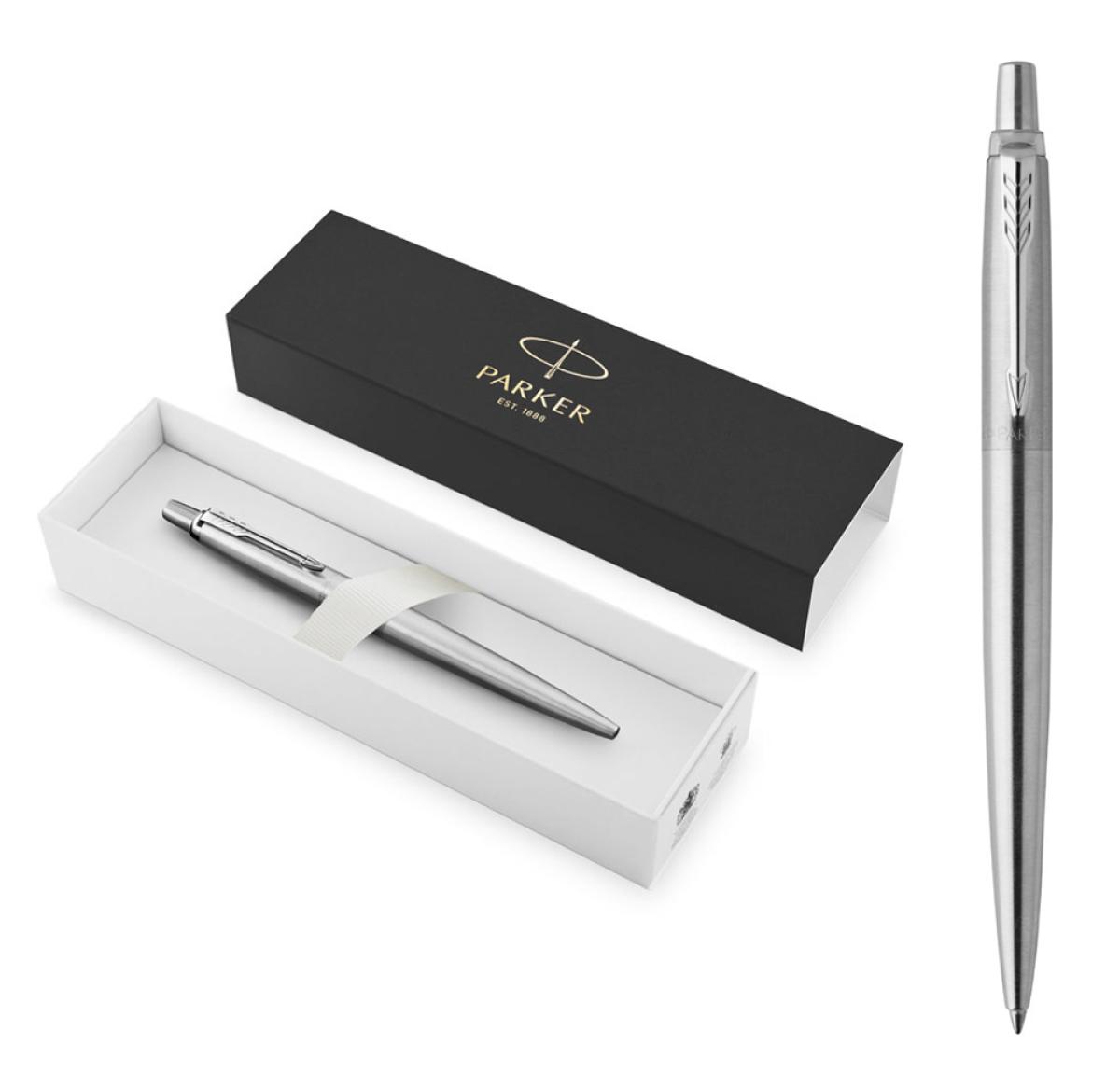 Parker roller pen Jotter Core, a classic among gel ink pens. Made in stainless steel, with chrome plated fittings and the brand's iconic arrowhead clip. With push-button mechanism, classic Parker inner cartridge and blue ink. Presented in an individual black case with Parker logo.