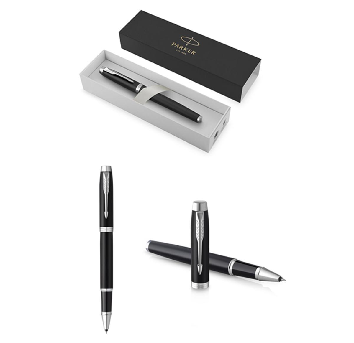 Parker roller pen IM Essential, in matte black lacquered metal barrel and cap; with chrome-plated trims. Cap with the brand's iconic arrowhead clip. In black ink and presented in an individual black case with Parker logo.
