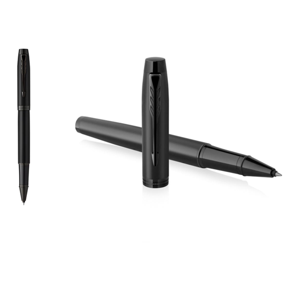 Parker roller pen IM Achromatic, made in stainless steel with matte black lacquer finish and blue ink. With black trim; and cap with the brand's iconic arrowhead clip, also in black. An elegant, refined and tested design, complemented with a modern silhouette. Presented in an individual black case with Parker logo.