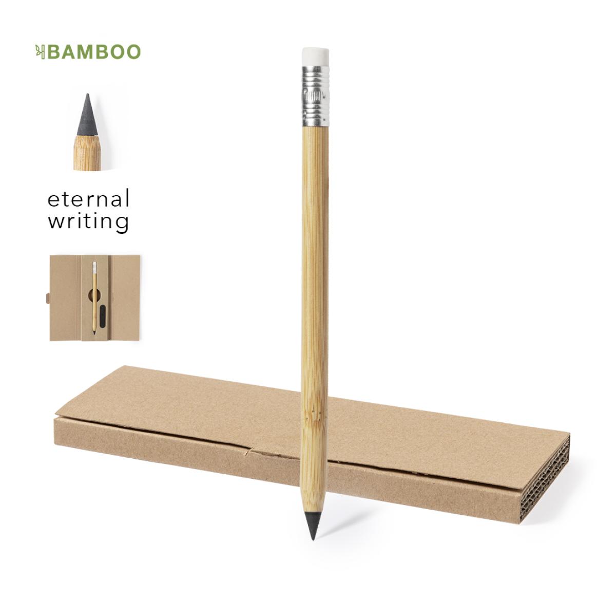 Everlasting pencil made of bamboo. Reusable and with infinite writing, so the same pencil is always used and no waste is generated. Including eraser on the top of the pencil. Presented in an individual die-cut case made of recycled cardboard containing a sharpening file. Materials such as bamboo encourage the use of natural raw materials and reduce pollutant emissions. In addition, bamboo comes from a highly resistant and versatile plant, with fast growth and regeneration, making it an excellent alternative to the use of traditional wood.