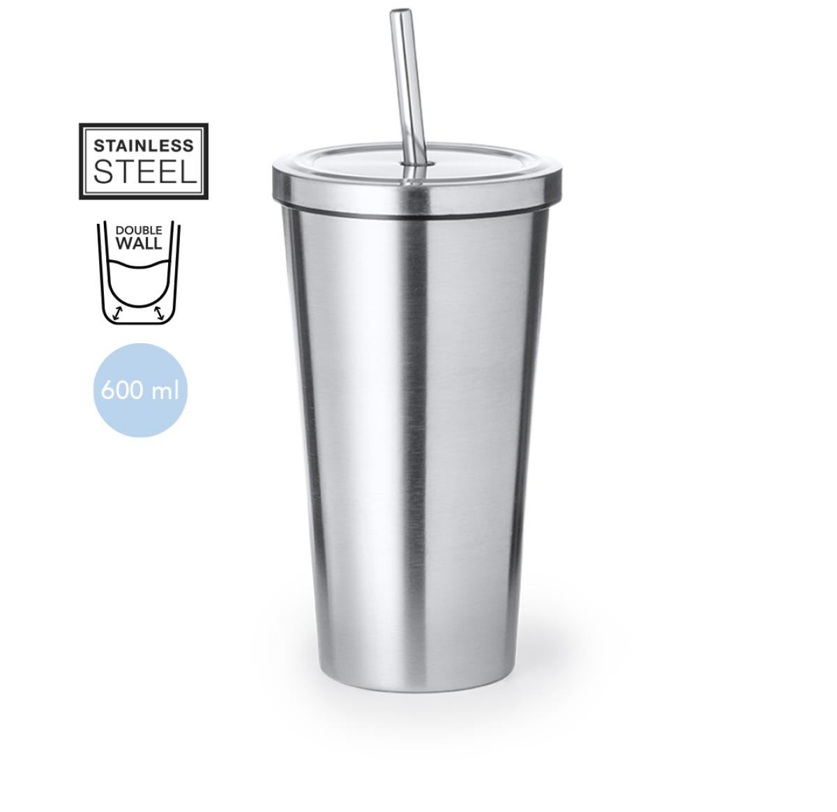 Stylish 600ml capacity double walled stainless steel thermal cup. Matte finish, with screw-on lid and matching straw. Presented in an individual kraft design box.