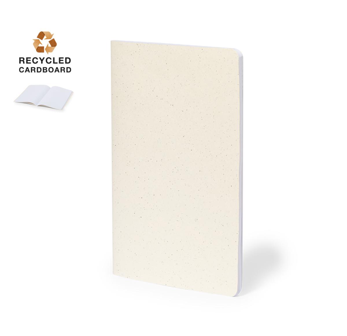 Notebook with covers made of recycled cardboard and matching stitched finish on the spine. Inside with 60 white pages. Presented in an individual recycled bag.
