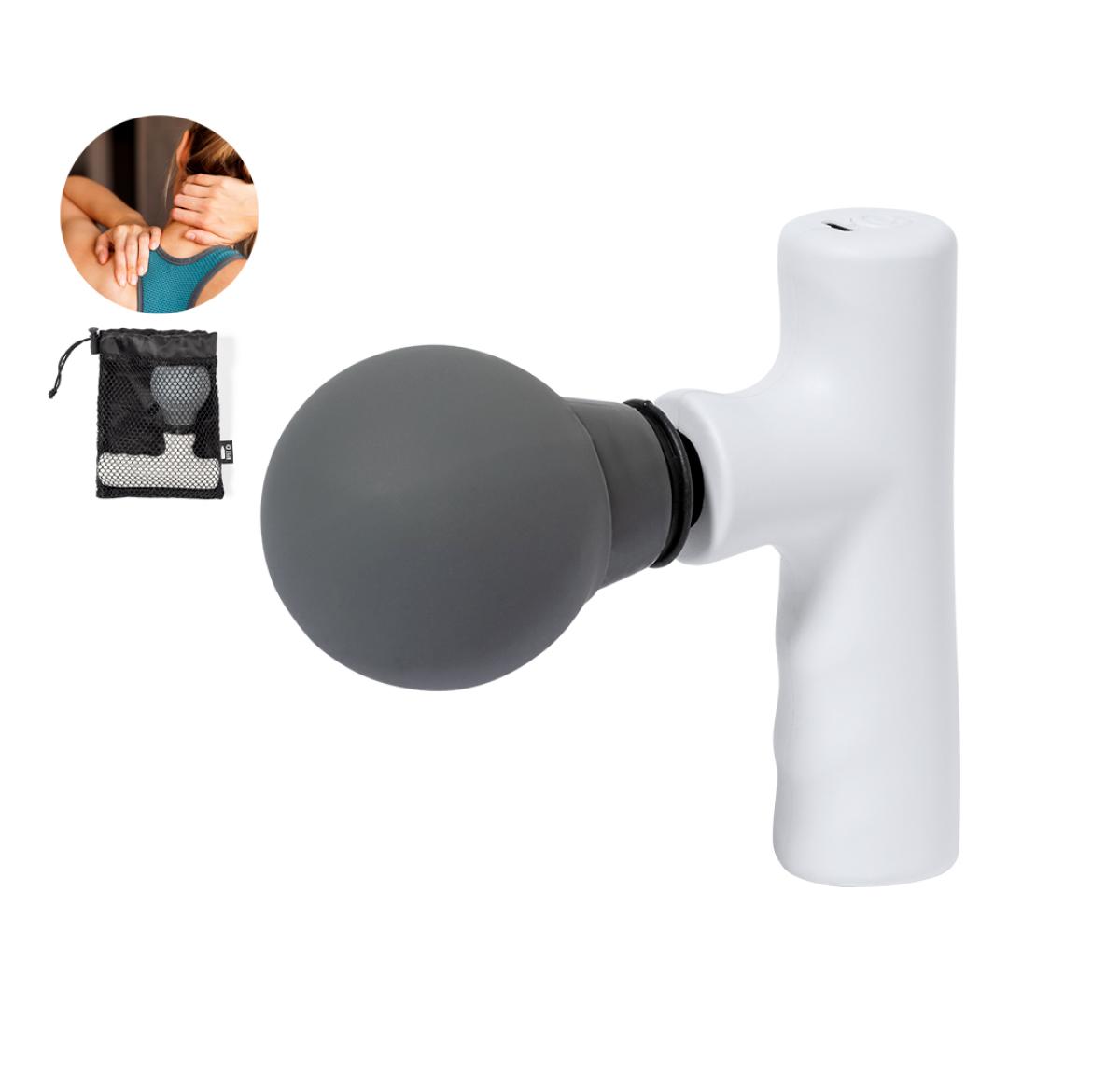 Electric massager. Helps to relax muscles, relieve the effects of training, release tension and revitalise the body. With two intensity settings. Long-lasting 800 mAh rechargeable battery - USB cable included-. With user manual in English and Spanish. Presented in a RPET polyester case with drawstring closure, made from recycled plastic to promote the reuse of plastic waste and contribute to the sustainability of the planet. Distinctive RPET label on the pouch.