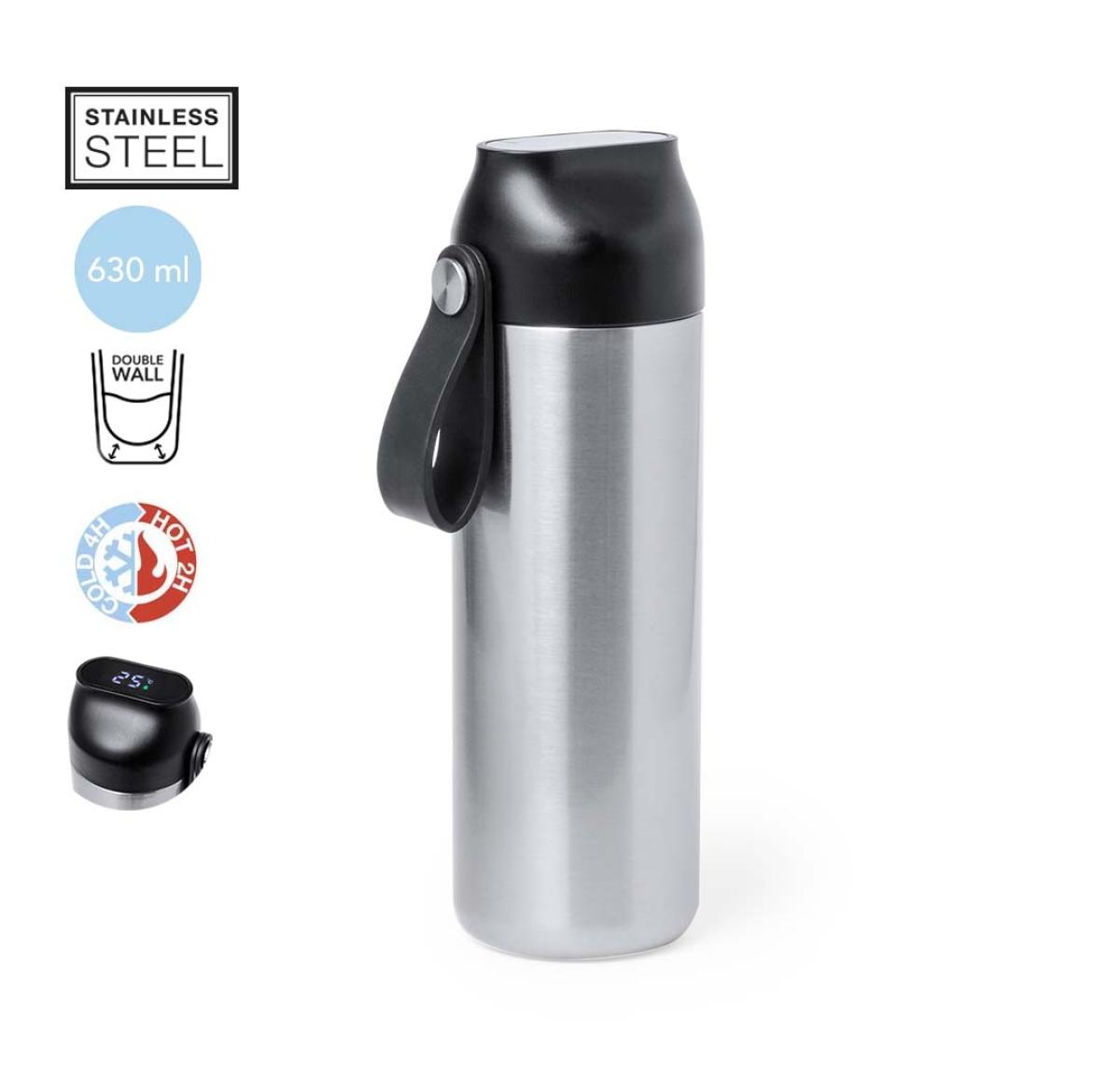 Double wall stainless steel thermal bottle with a capacity of 630ml. Includes a tactile temperature indicator in the cap, with integrated handle. BPA free safety cap and presented in an attractive individual kraft design box in a recycled bag. Battery powered (button cell included), with instruction manual available in English and Spanish.