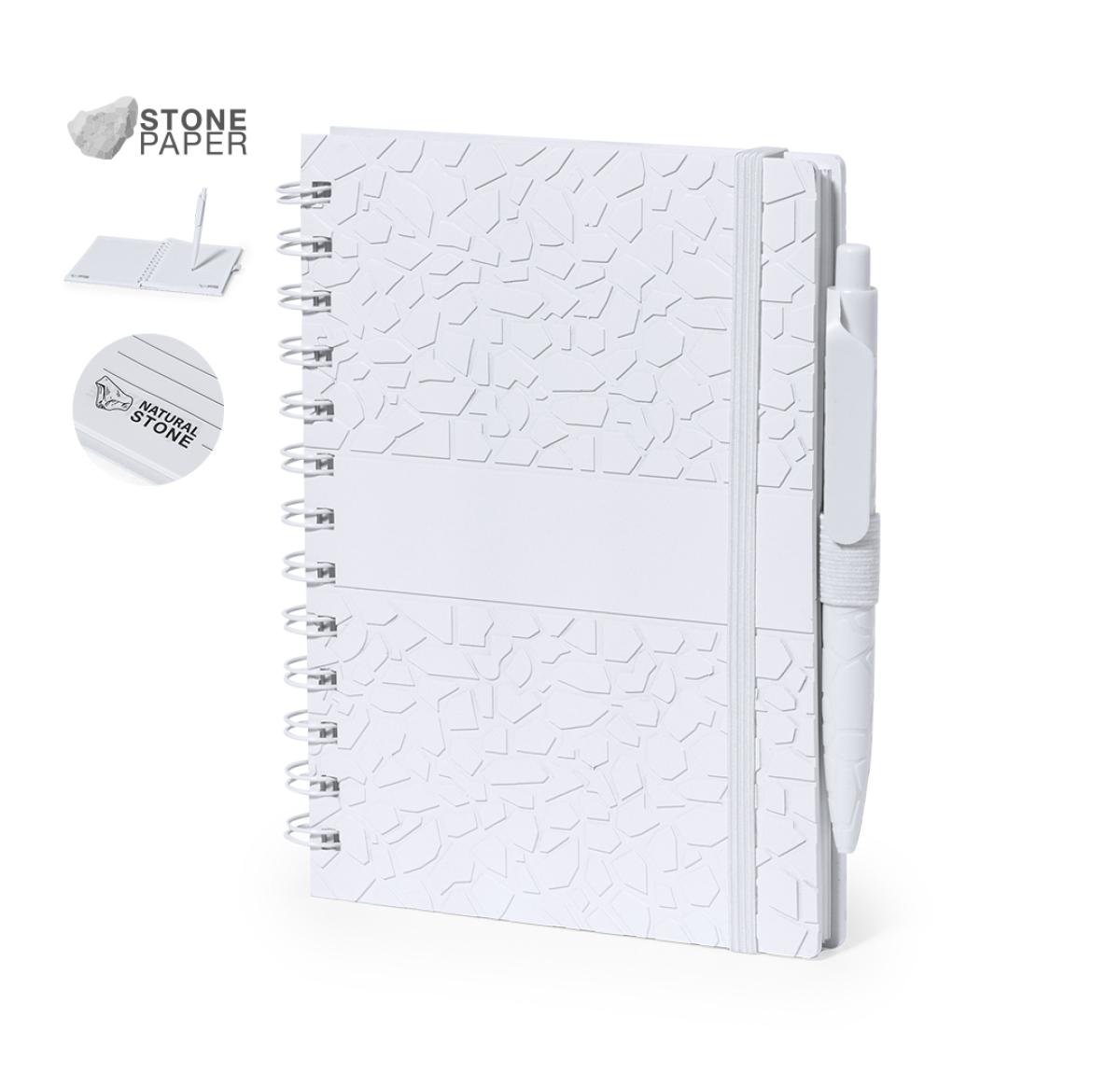 Notebook and pen set. Contents: Ring notebook with hard cover made from stone extracts, in elegant white finish with pen holder. Unique cover with embossed design. 70 white sheets and single-stripe layout, with Natural Stone logo. Ball pen in nature line with push-button mechanism. Die-cut barrel made from natural stone extracts, helping to reduce the use of plastics, as well as providing a smooth, durable finish. In white with Natural Stone logo on the top. Jumbo cartridge and blue ink. The material used in the production of the notebook is 100% recyclable and chlorine-free, with waterproof properties, highly resistant and washable, making it an ecological and sustainable alternative to conventional paper, which does not come from traditional paper or trees. Presented in an individual recycled bag