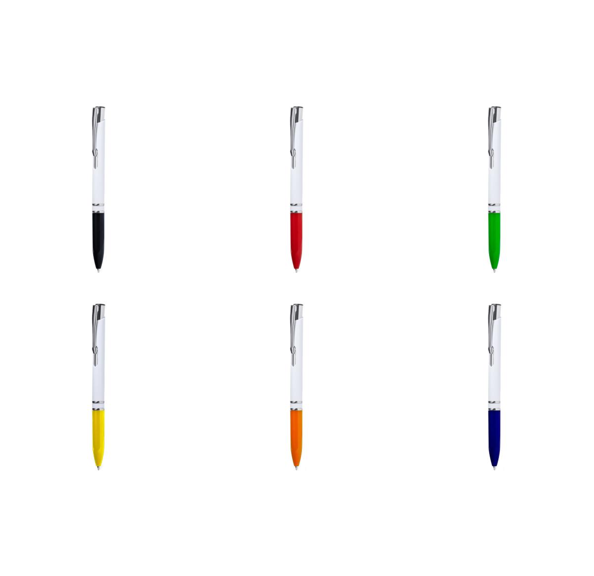 Elegant ball pen with push-button mechanism. With body finished in gloss white and grip in a wide range of colours. Made of durable ABS with glossy finish. Jumbo cartridge and blue ink.