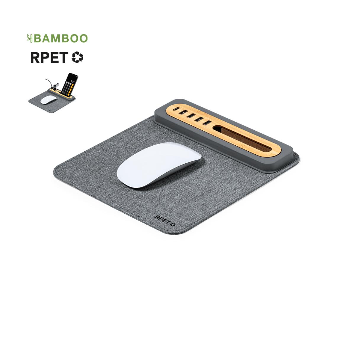 Stylish and functional mouse pad made of a combination of soft RPET polyester and bamboo. With Type-C port and four USB 2.0 ports, for easy connection and charging of devices. With smartphone holder and non-slip base for comfortable and stable use. Bring a new era of connectivity and sustainability to your workspace. Presented in an individual kraft design box and in a recycled bag. RPET material is made from recycled plastic to encourage the reuse of plastic waste and help the sustainability of the planet.