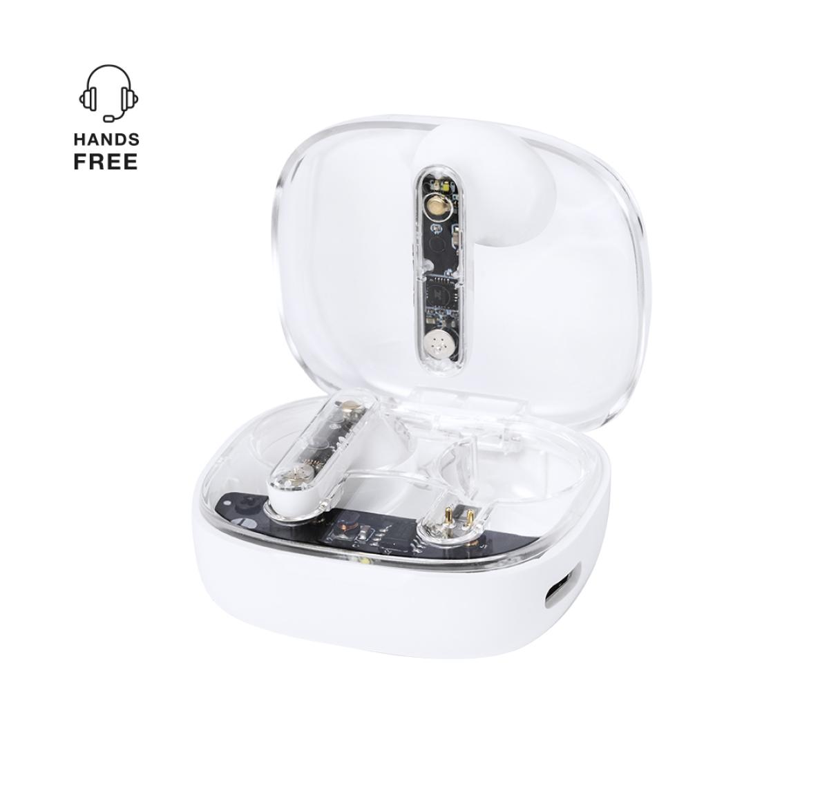 Earphones in distinctive transparent design. Bluetooth® 5.3 connection and long battery life. Ergonomically designed, with integrated touch control button on the headset, matching charging base and charging status indicators. Hands-free function. Charging port with Type-C input (cable included). Presented in individual kraft design box and recycled bag.