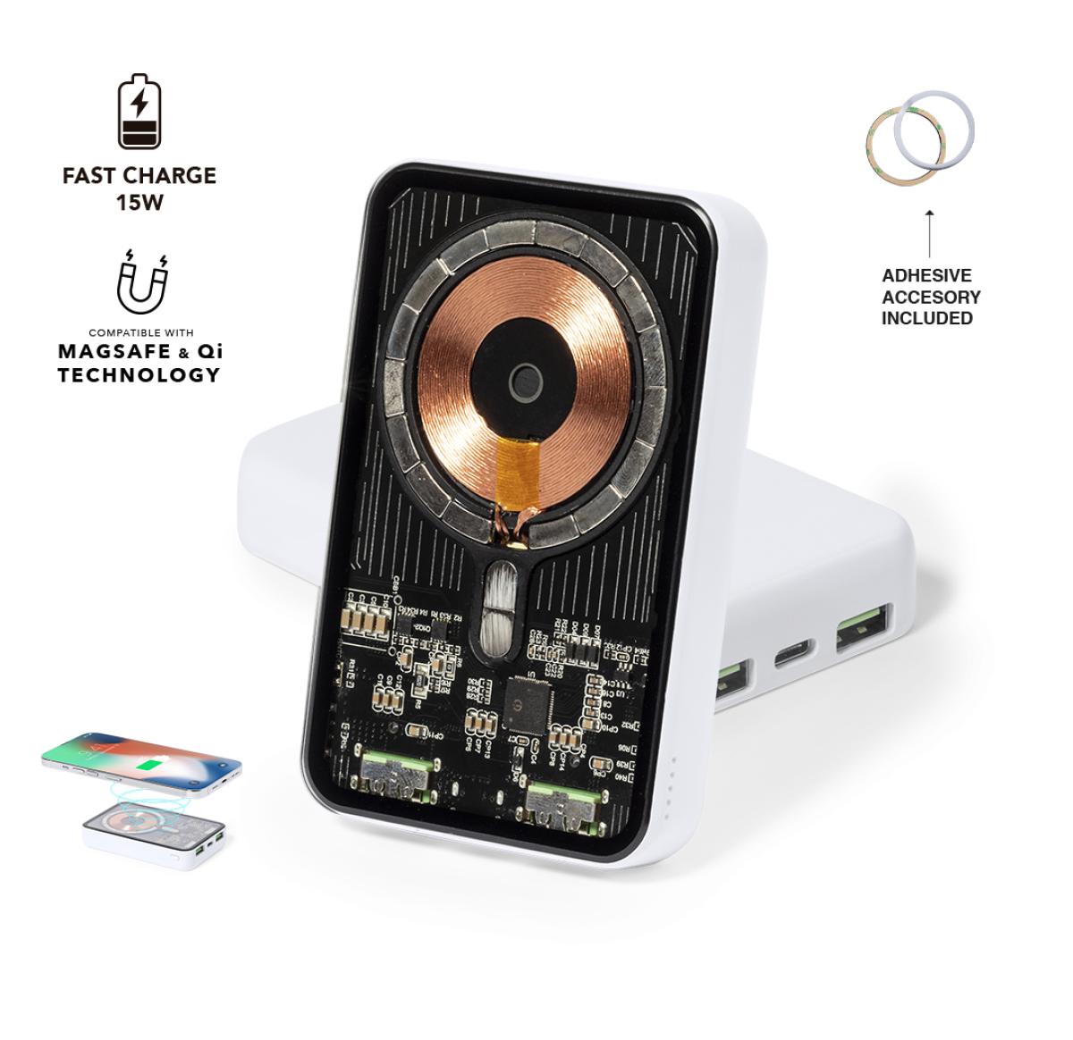 External auxiliary battery in unique transparent design, with 5,000 mAh charging capacity. Integrated 15W wireless charger and Type-C input/output + USB output connectors. With Magsafe magnetic attachment, for a firm hold of the device, compatible with devices equipped with Qi wireless charging technology. Charging cable included, with instruction manual available in English and Spanish. Presented in an individual eco-designed box in kraft cardboard. Input/Output Type C: 5-12V DC 3-1.67A, 20W USB Output: 5-12V DC 3-1.5A, 18W The capacities shown in all our external auxiliary batteries are real, all of them incorporating non-recycled, grade A batteries, with a service life of at least 500 charging cycles, and complying with CE regulations. In addition, they are manufactured according RoHS standards, and in compliance with the following safety requirements: Power bank overcharge protection system. Complete discharge protection system, which increases the durability of the power bank. Blocking system to prevent short circuits. Constant charging transfer system, in accordance with the capacity of the target device.