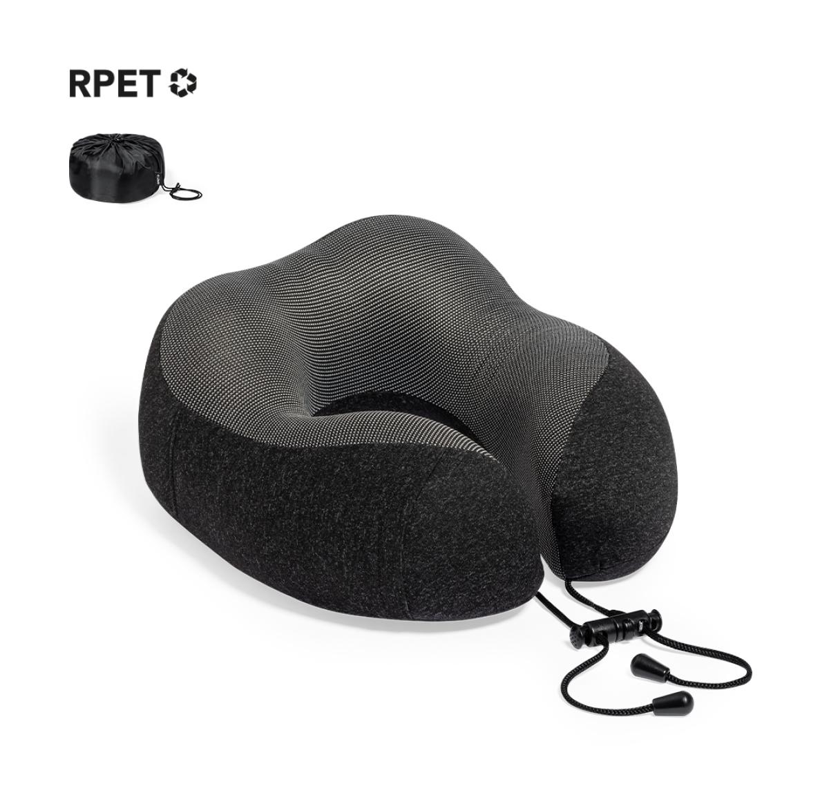 Comfortable and padded portable neck pad. Ultimate comfort experience for any journey due to the soft touch padding and drawstring fasteners for a correct and comfortable fit. With RPET pouch for protection during transport and label. RPET material is made from recycled plastic, thus promoting the reuse of plastic waste and helping the sustainability of the planet. Polyester RPET Pouch