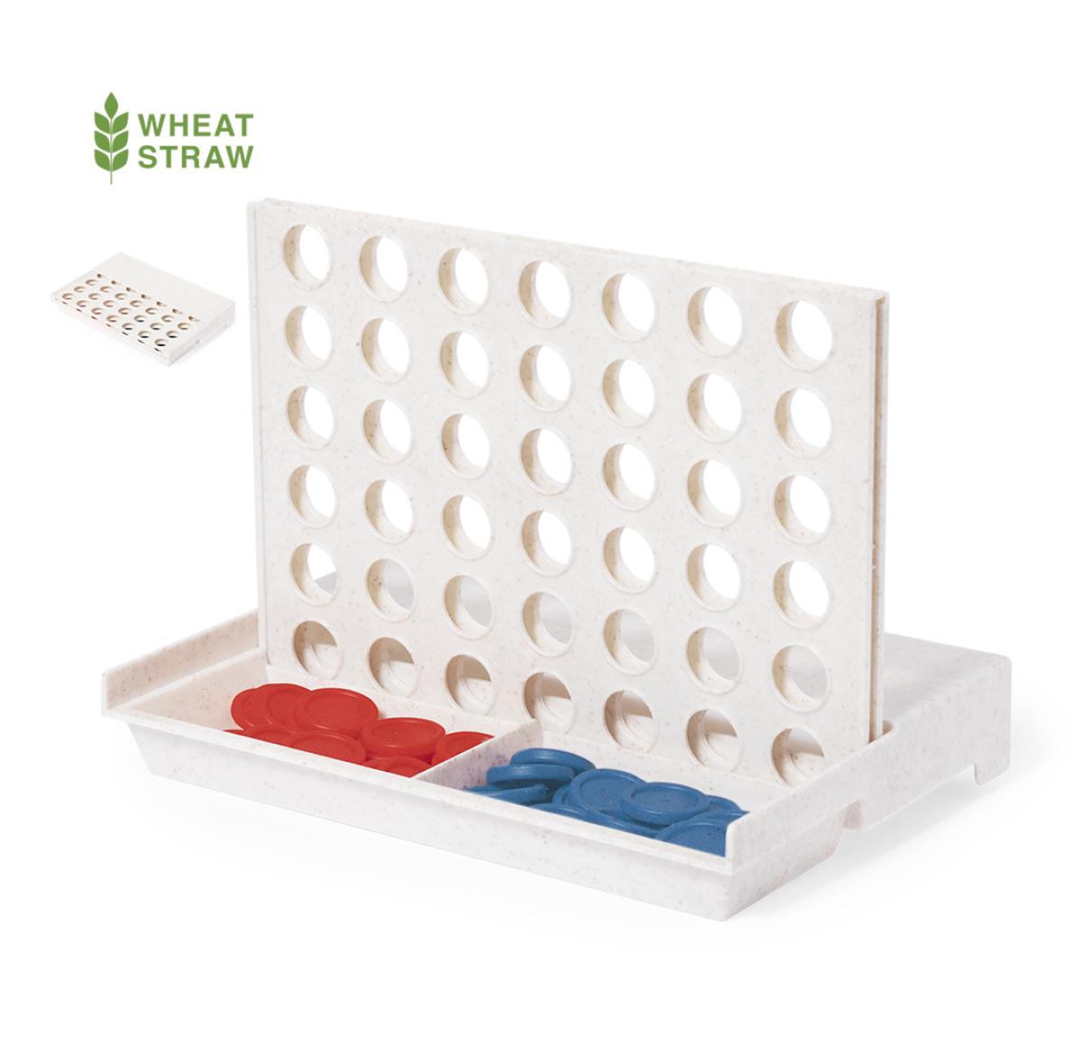 Fun board game made of wheat straw. Composed of a vertical board and 42 circular pieces (21 red and 21 blue). Exciting for all ages by inserting the pieces through the slots to get 4 pieces in 1 row. Easy to assemble thanks to its mobile board that can be unfolded or folded. Presented in a kraft design box. 42 Pieces