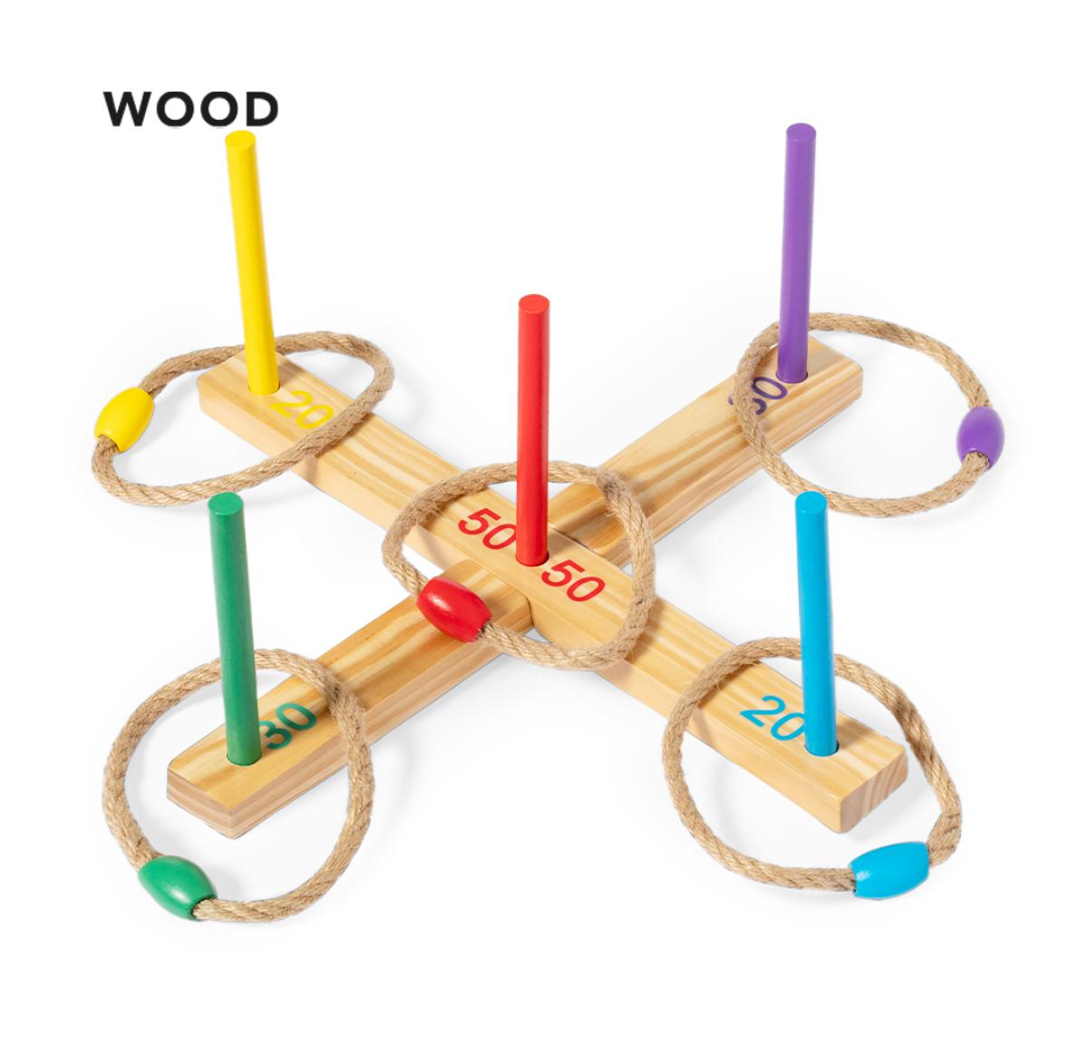 Aiming game made of wood. Involves inserting the rope rings into the base with sticks in the same colour (each colour scores differently). Compact and easy to assemble, including 12 pieces. With instructions in English and Spanish. Presented individually in a kraft design box. 5 Pieces