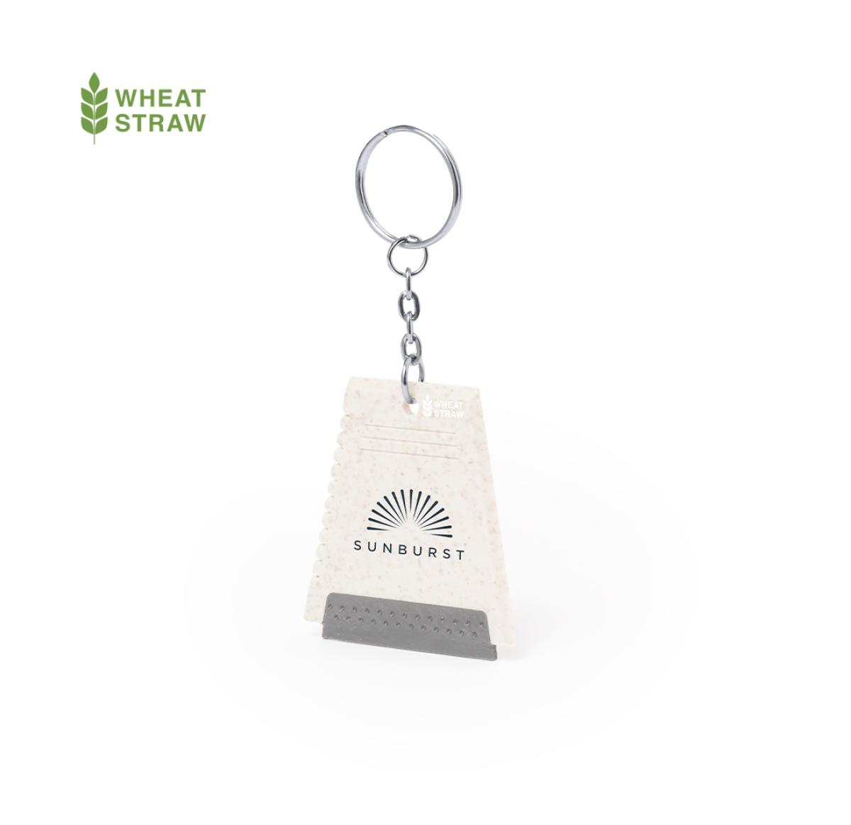 Practical keyring with ice scraper, made of wheat straw. Equipped with saw teeth for tackling the toughest ice and including a cleaning accessory. Wheat straw logo on the top corner and presented individually in a kraft paper bag. Wheat straw promotes the use of natural raw materials, thus reducing pollutant emissions.