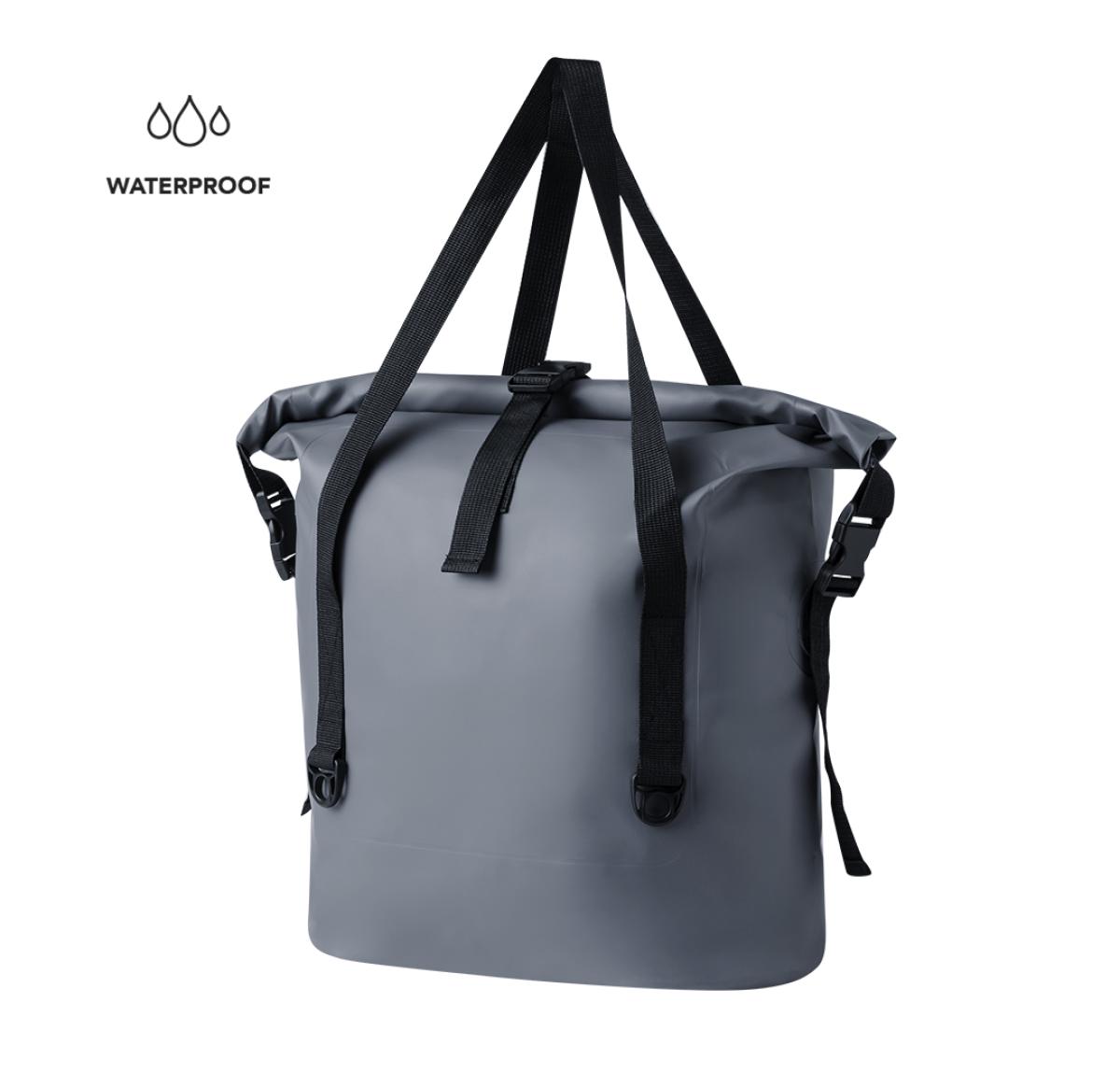 Waterproof bag with 25L capacity, made of durable PVC. Main compartment with triple buckle closure, with handles for comfortable carrying. In stylish grey color with black accents, and presented in an individual recycled bag. Waterproof