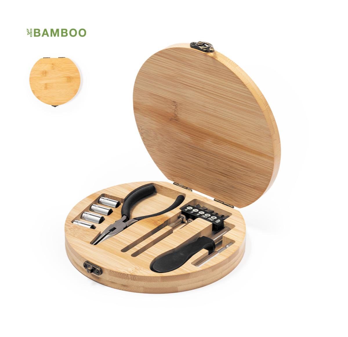 Tool set presented in a resistant bamboo box with metal closure. With bamboo die-cut interior for a perfect fit of the tools. Including 15 accessories: socket spanners, pliers with cutting function, precision screwdrivers (flat and phillips) and screwdriver with a multitude of flat, phillips, hex and torx bits. Presented in a kraft design box. Materials such as bamboo promote the use of natural raw materials, thus reducing pollutant emissions. It comes from a highly resistant and versatile plant, with rapid growth and regeneration, making it an excellent alternative to the use of traditional wood.