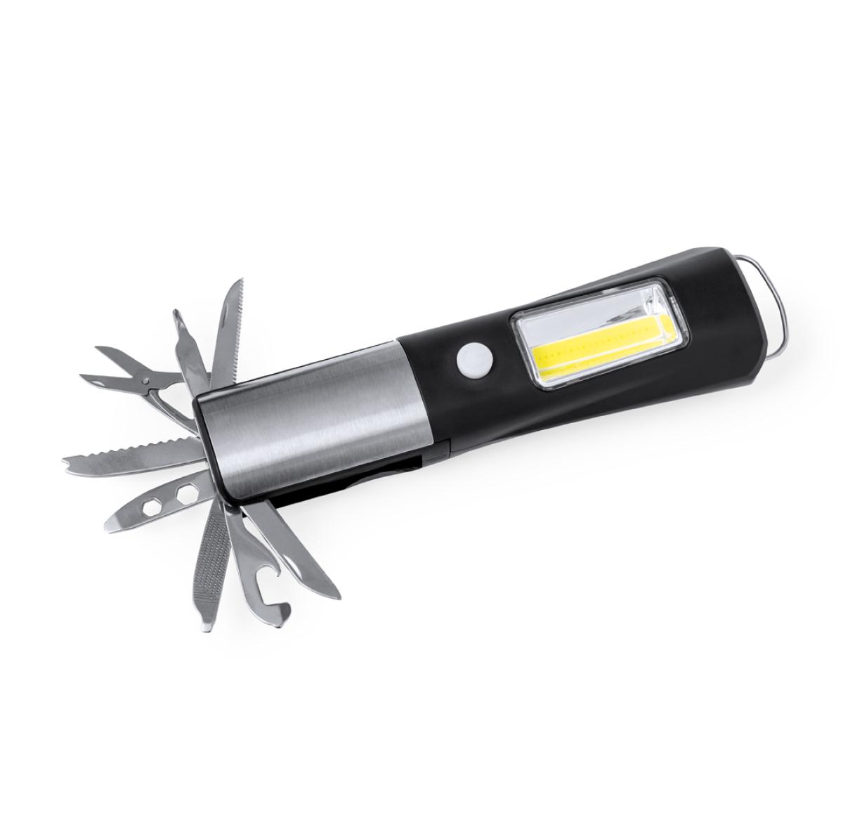 Practical multi-tool made of durable ABS and stainless steel, with integrated 1 LED headlamp. Includes 19 COB side torch with two lighting positions ( steady and flashing ). It has 13 functions, including flat knife, serrated knife, philips screwdriver, scissors, flat screwdrivers, hexagon spanner in various sizes, can opener, bottle opener and a file. With magnet and handle. Powered by 3 AAA batteries, not included. Presented in a kraft design box.