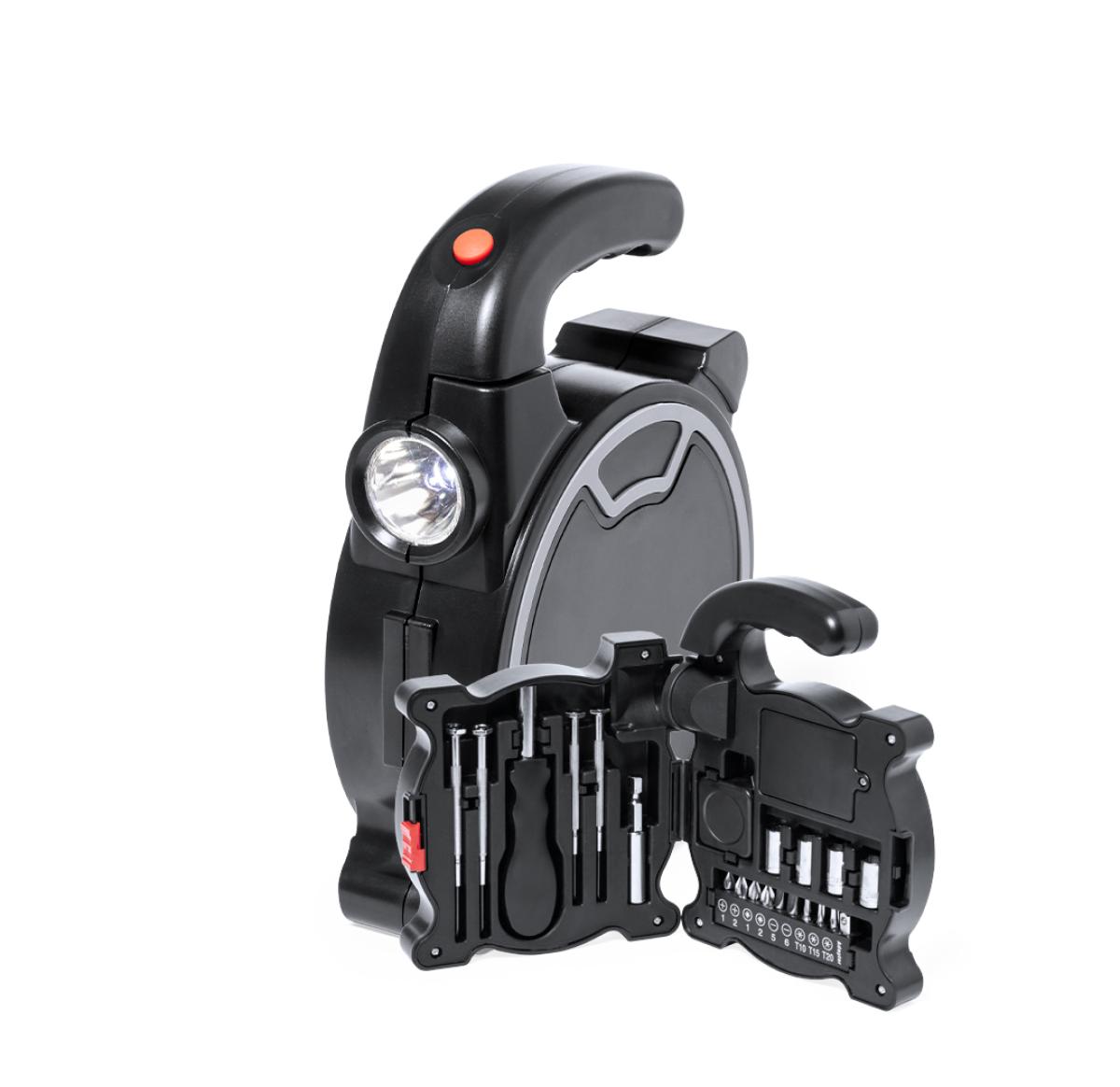 Tool set in ABS case with built-in torch and ergonomic handle, supplied with 4 LEDs powered by 3 AAA batteries (not included). It has 21 accessories inside: precision screwdrivers (flat and philips), multifunction tool handle for compatible bits (philips, flat, adapters), socket spanners and flexometer. Presented in a kraft design box.