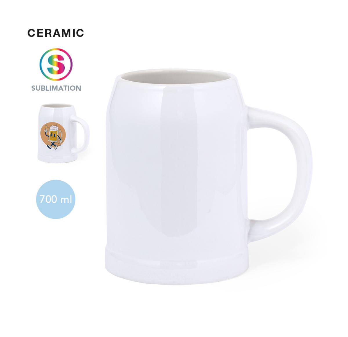 Ceramic jar in elegant white finish for the beer lovers. 700 ml capacity and with comfortable handle. Specially designed for sublimation printing and presented in an individual kraft box. 700 ml