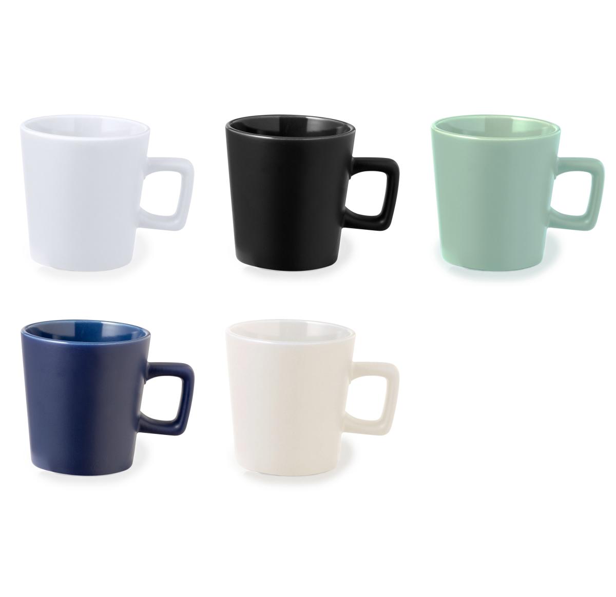 Ceramic mug with a capacity of 300 ml. Distinguished design with square handle and in several matt colours. Presented in individual box with kraft finish. 300 ml