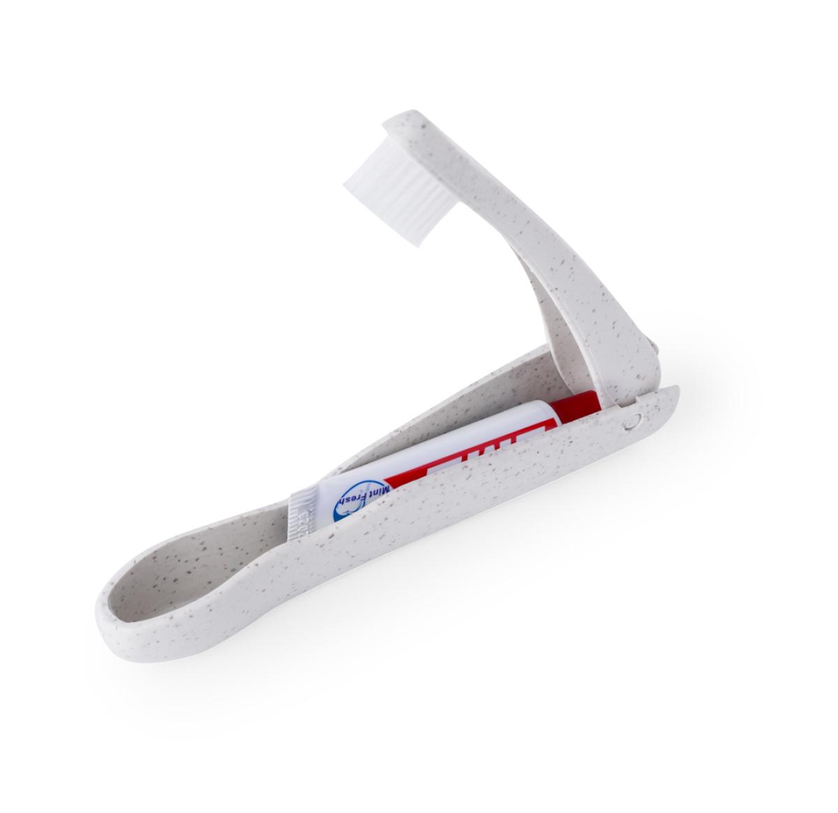 Handy folding toothbrush made of resistant wheat straw. Including a compartment to store a tube of toothpaste 6g (included). Wheat straw promotes the use of natural raw materials, thus reducing pollutant emissions.
