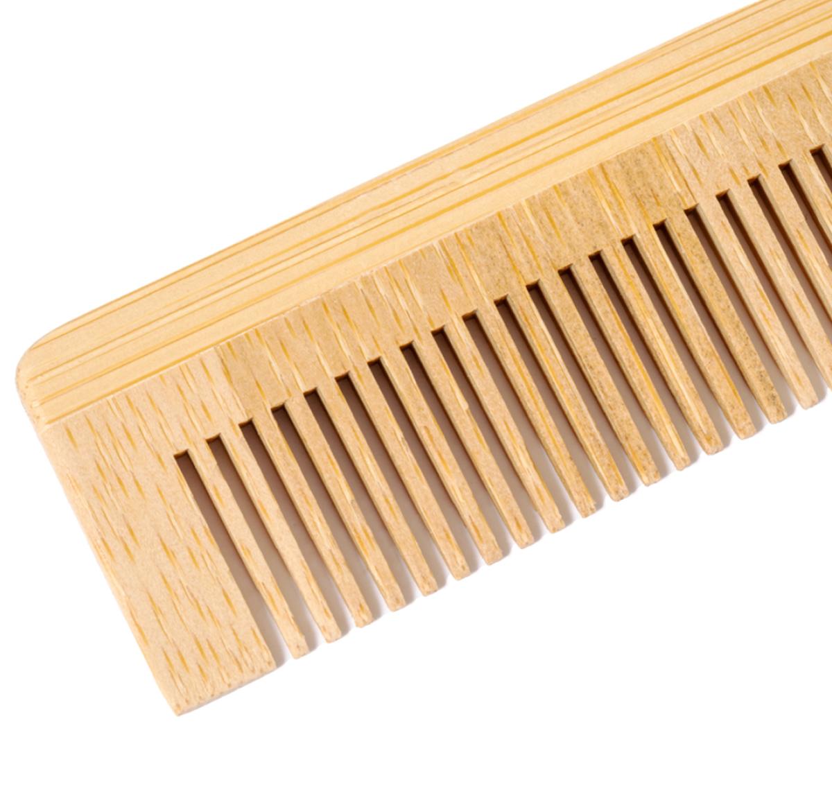 Comb made of polished bamboo with equal bristles. Individually packaged in a recycled paper bag.