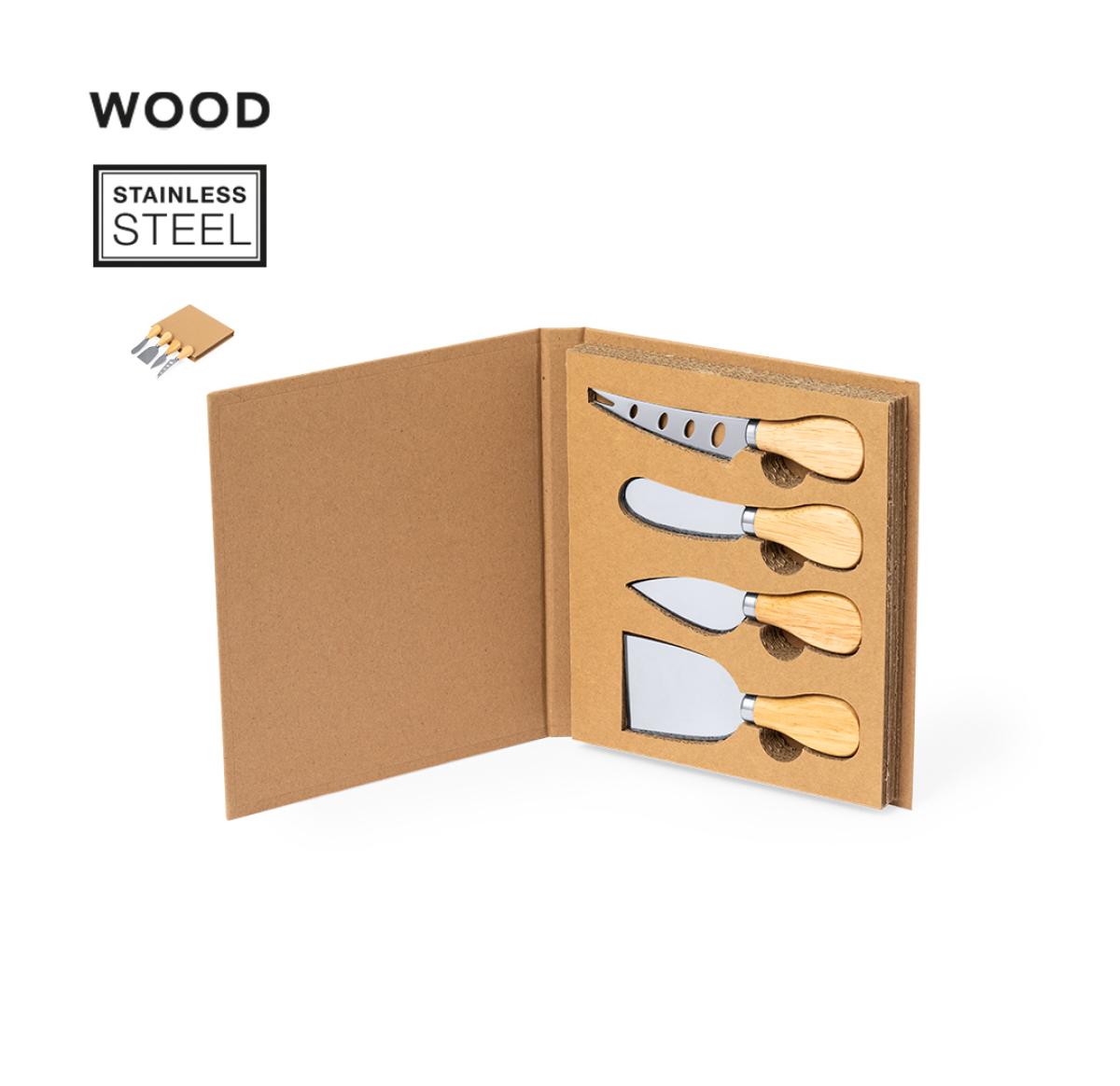 Cheese set made of wood. Utensils made of stainless steel and wooden handle, with four different models: for hard cheeses, soft cheeses, semi-hard cheeses and cheese chunks. Presented in an original Recycled cardboard box, with a die-cut inside for each accessory. 4 Pieces