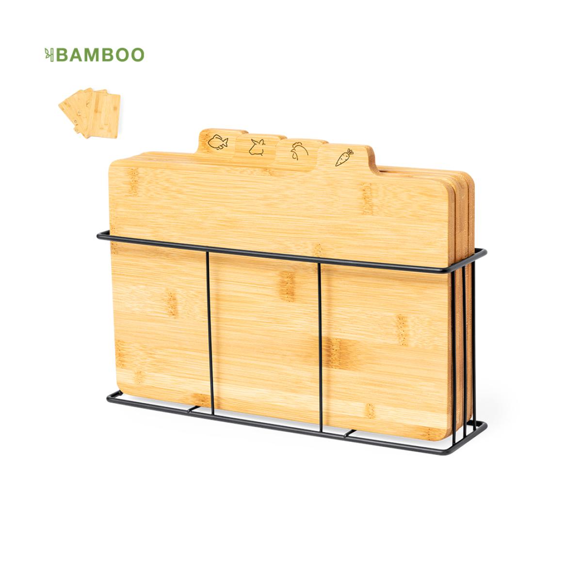 Set of cutting boards made of bamboo, each one easily identifiable by the cutting patterns, carved specifically for fish, white meat, red meat and vegetables. Including a metal basket with guides for tidy storage. Presented in a kraft design box. Materials such as bamboo encourage the use of natural raw materials, reducing pollutant emissions. In addition, bamboo comes from a highly resistant and versatile plant, with rapid growth and regeneration, making of it an excellent alternative to traditional wood. 4 Pieces