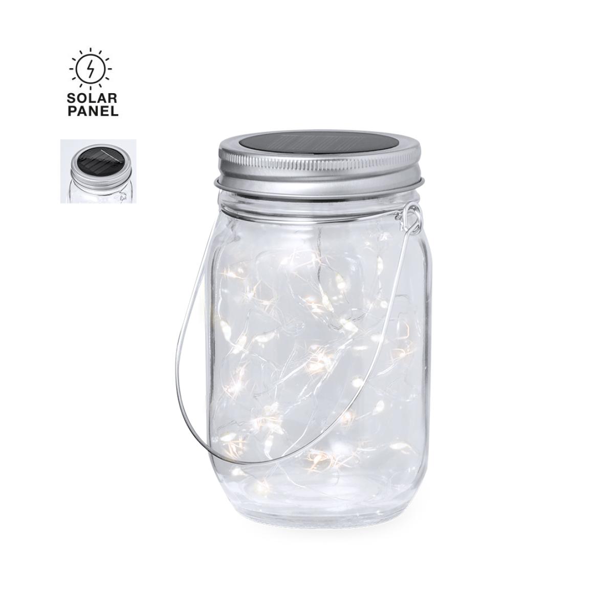 Cool, solar powered jar and lamp, made in resistant glass material, with a decorative inner strip of 20 LEDs. Including metal screw lid, with an integrated mini rechargeable solar panel and 300 mAh rechargeable battery. With practical handle for carrying or hanging, and presented in an individual kraft design box. 20 Leds. Solar Charging. Battery 300 mAh