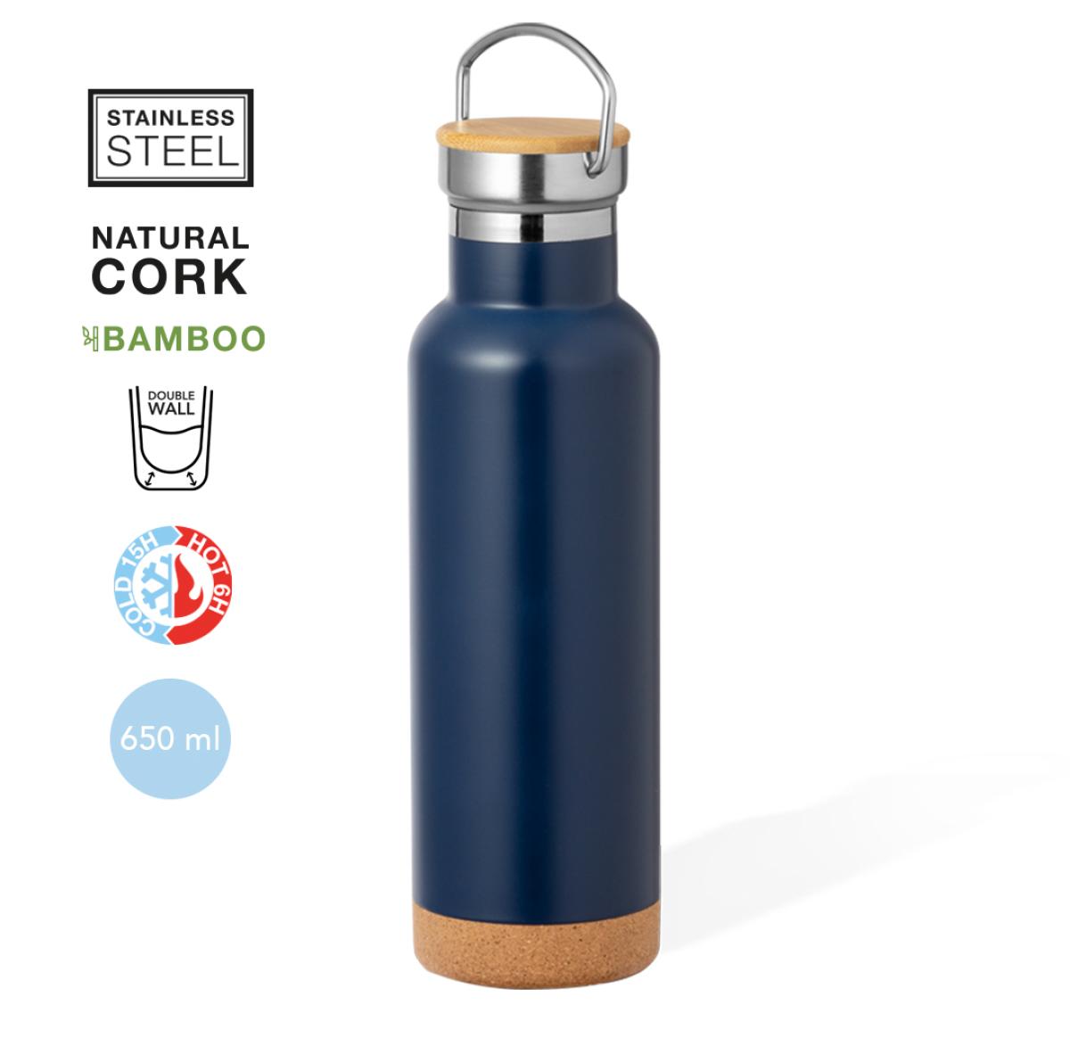 650 ml capacity thermos flask, made of stainless steel with double wall. Includes original stainless steel screw cap, with bamboo detail, integrated handle, and an original cork base. Available in a wide range of colours and presented in an individual kraft design box. 650 ml