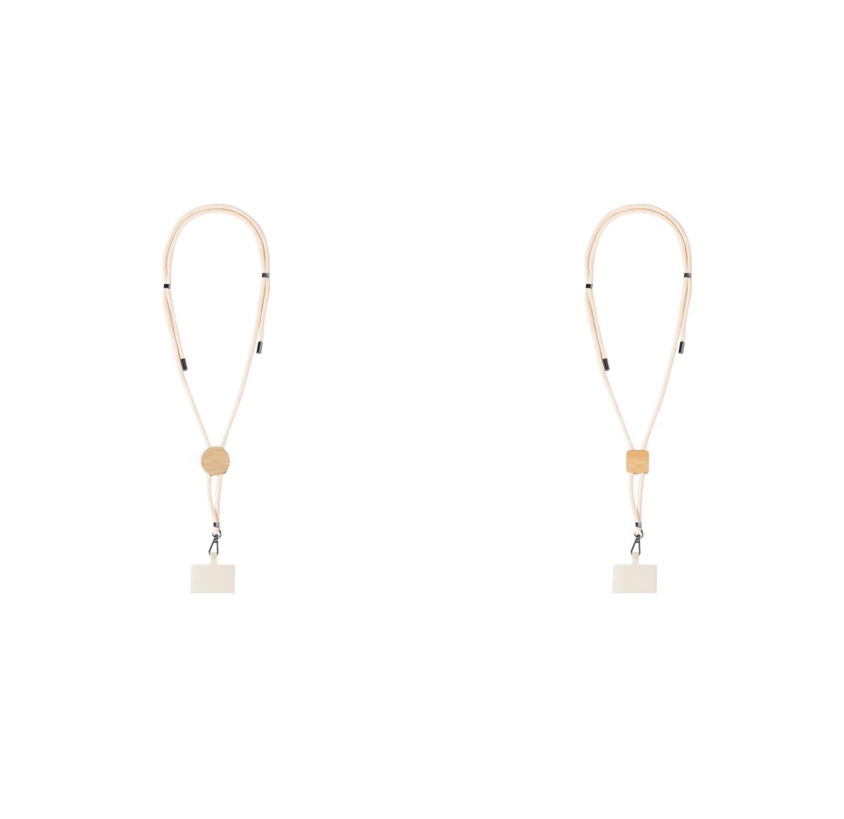 Original lanyard with smartphone accessory. Made of resistant cotton, with bamboo accessory for branding. Carrying accessory to place between the case and the smartphone, with metal swivel carabiner. Collar adjusters, with chrome-plated fittings at the ends of the drawstrings. Materials such as bamboo encourage the use of natural raw materials, reducing pollutant emissions. It comes from a highly resistant and versatile plant with rapid growth and regeneration, making of it an excellent alternative to traditional wood.