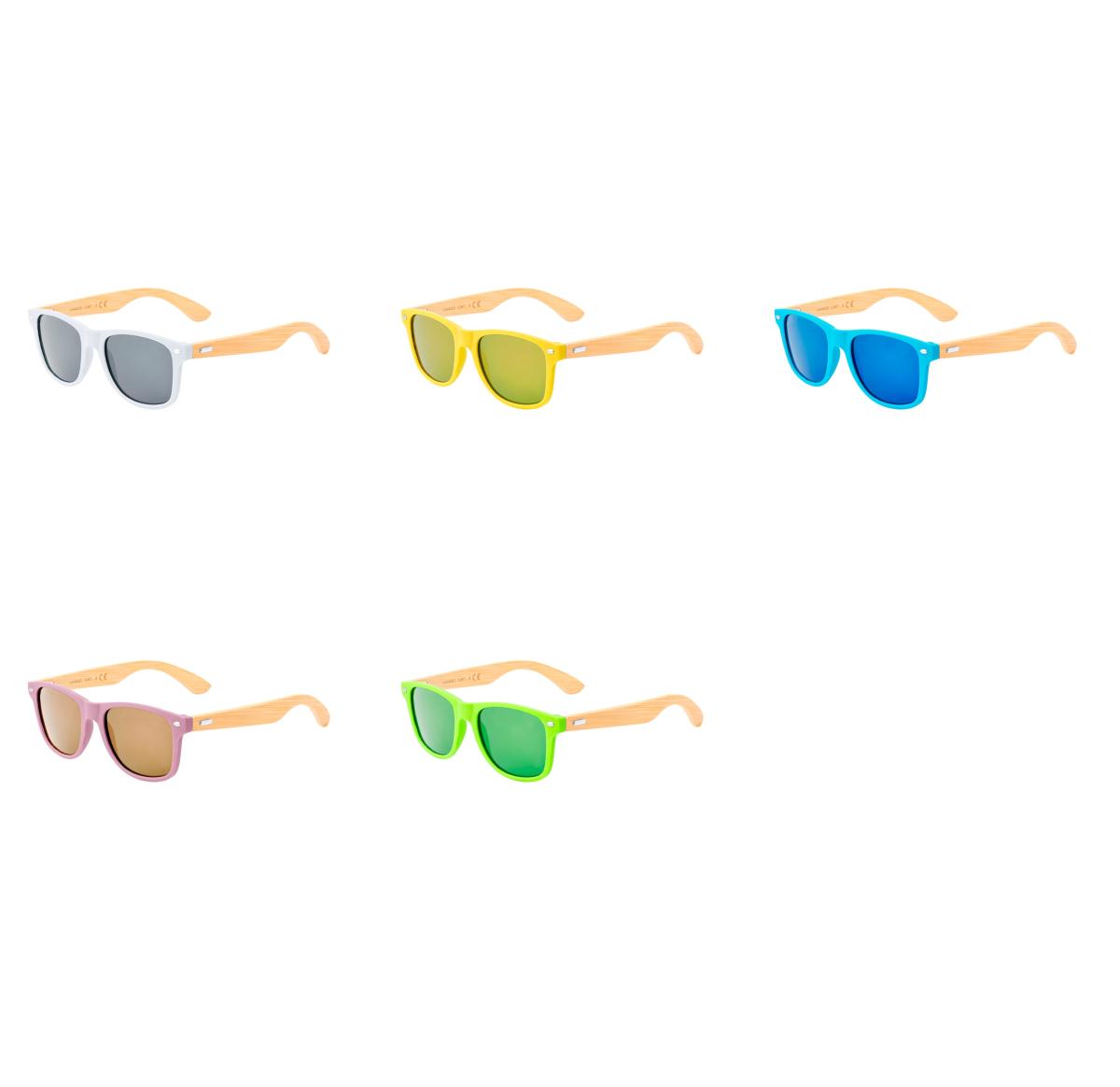Bamboo sunglasses with UV400 protection. Coloured frame in durable PC material and bamboo arms. Mirrored AC (cellulose acetate) lenses, available in a range of colours. Presented in an attractive kraft paper bag. Materials such as bamboo encourage the use of natural raw materials, reducing pollutant emissions. It comes from a highly resistant and versatile plant with rapid growth and regeneration, making of it an excellent alternative to traditional wood.